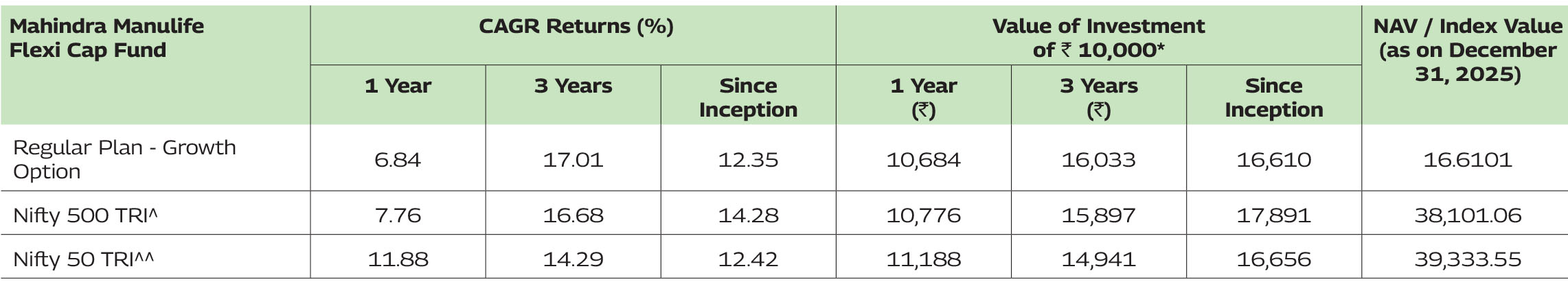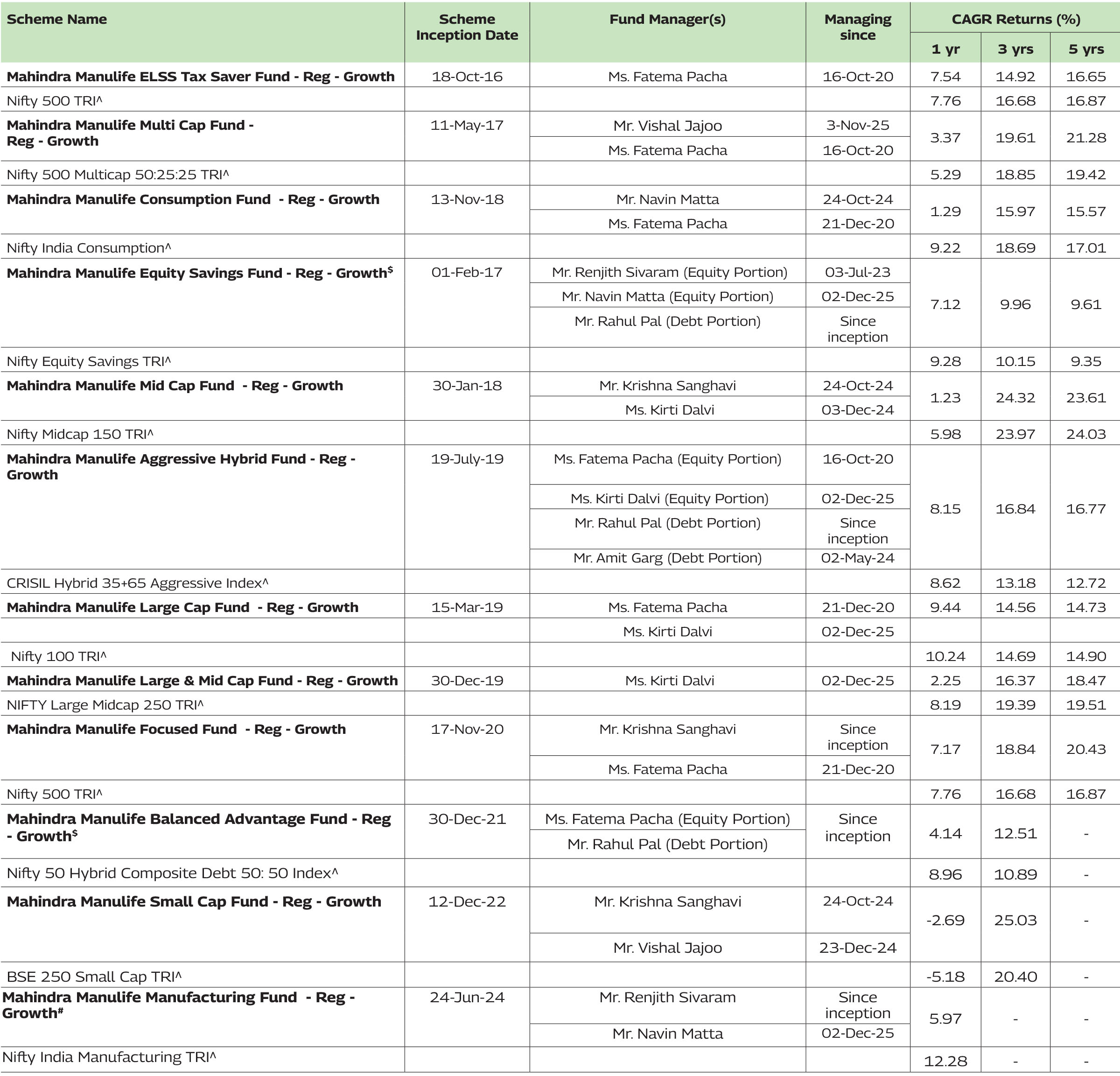 #Note: Pursuant to notice cum addendum no. 50/2025, the Benchmark of Mahindra Manulife Manufacturing Fund has been revised from ‘BSE India Manufacturing TRI’ to ‘Nifty India Manufacturing TRI’ with effect from December 22, 2025.