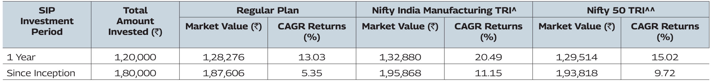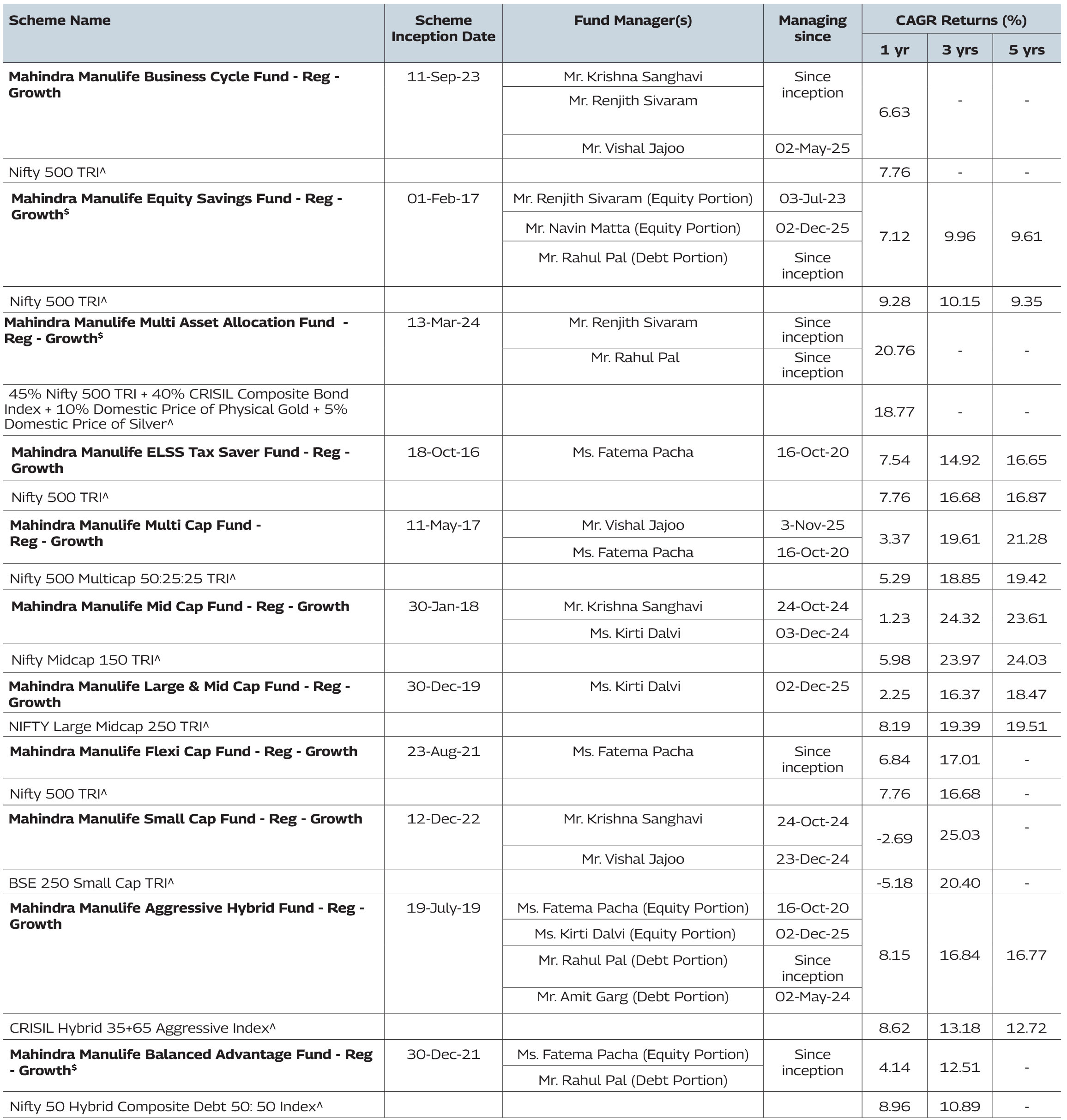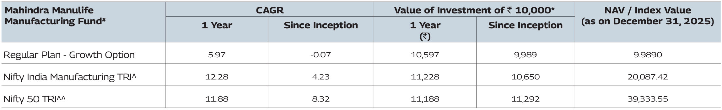 #Note: Pursuant to notice cum addendum no. 50/2025, the Benchmark of Mahindra Manulife Manufacturing Fund has been revised from ‘BSE India Manufacturing TRI’ to ‘Nifty India Manufacturing TRI’ with effect from December 22, 2025.