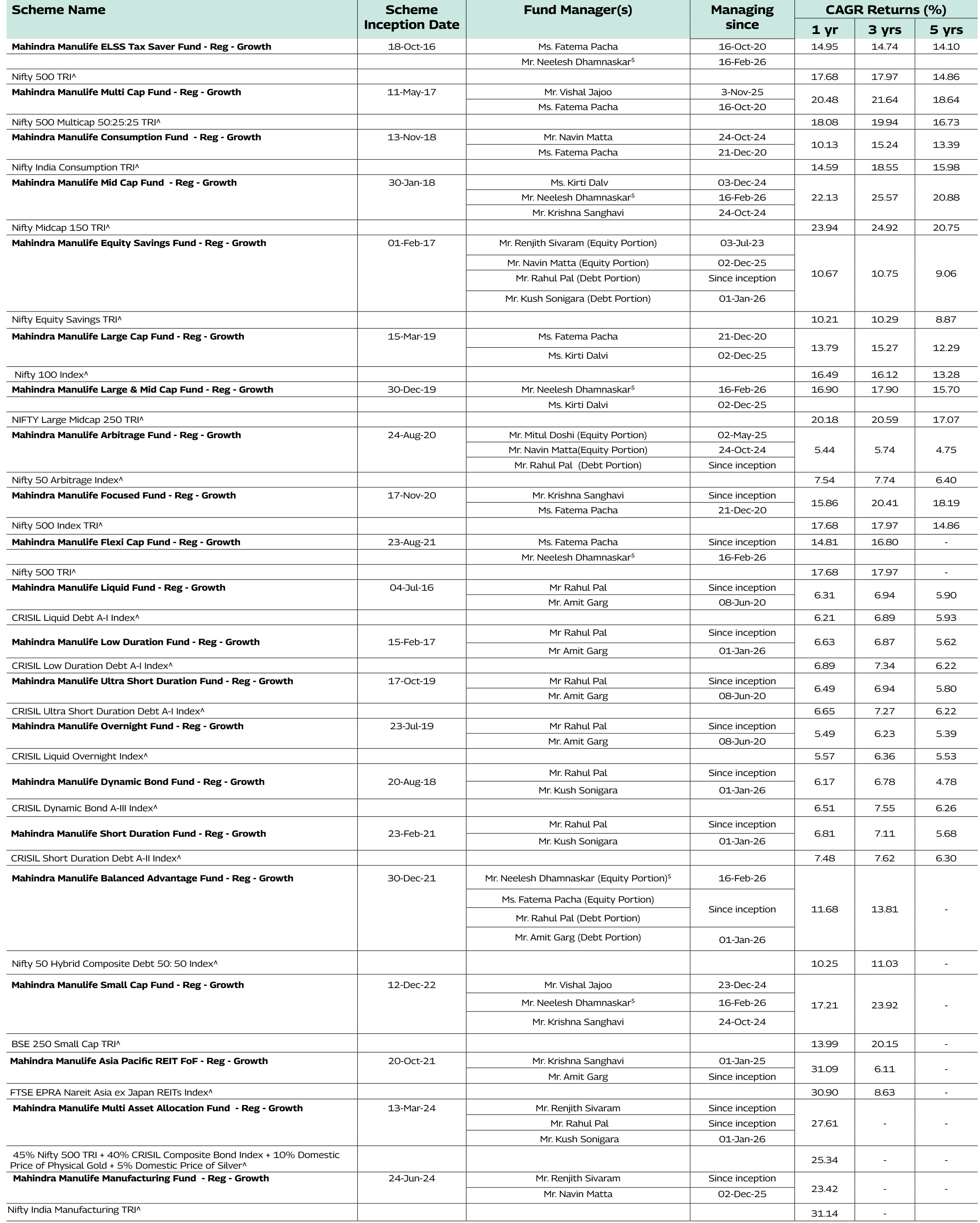 Note: As February 28, 2026 was a non-business days, the schemes returns disclosed are as on February 27, 2026, except for Mahindra Manulife Liquid Fund and Mahindra Manulife Overnight Fund