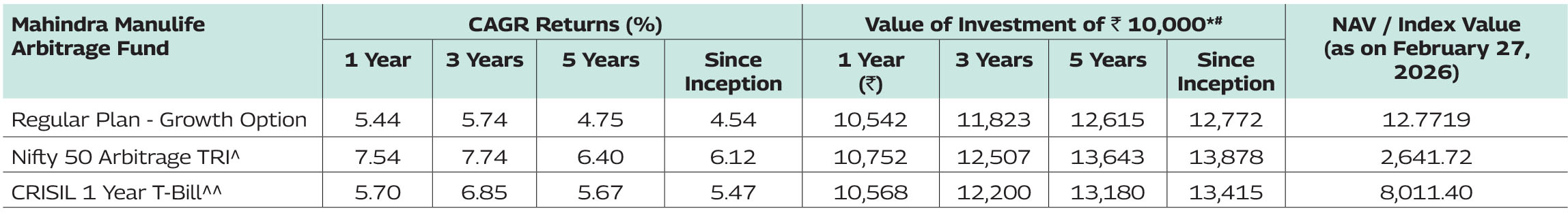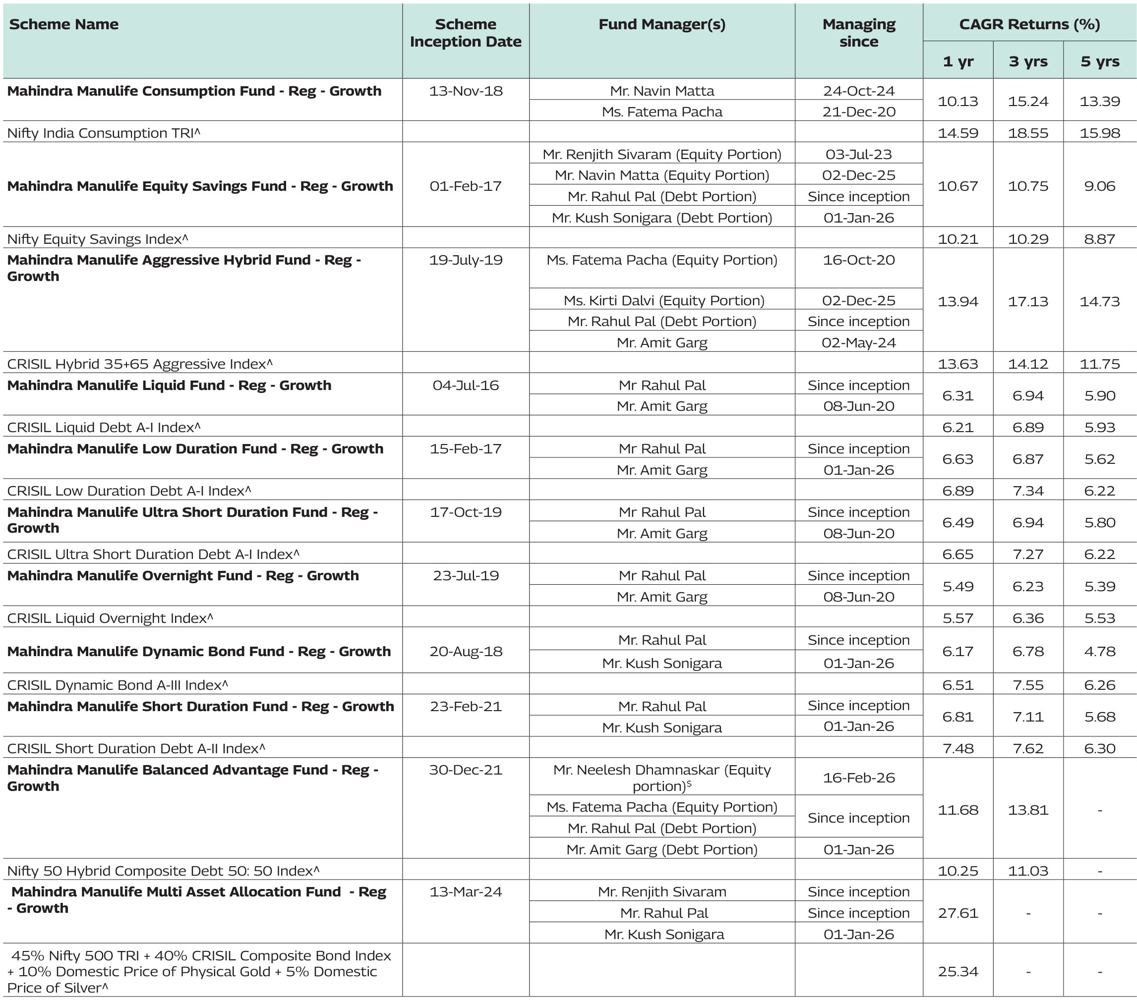 Note: As February 28, 2026 was a non-business days, the schemes returns disclosed are as on February 27, 2026, except for Mahindra Manulife Liquid Fund and Mahindra Manulife Overnight Fund which is as of February 28, 2026.