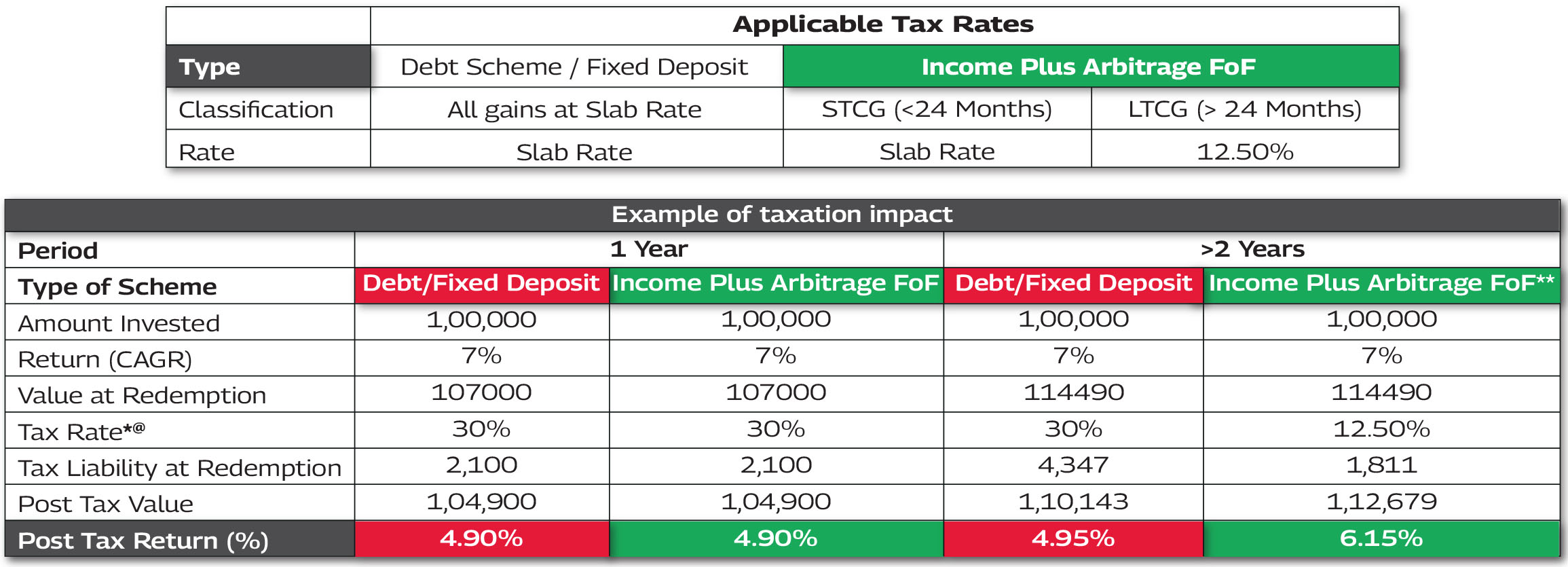 The Income Plus Arbitrage FoF seems to deliver relatively better post tax return than traditional fixed income instruments for a holding period exceeding 24months