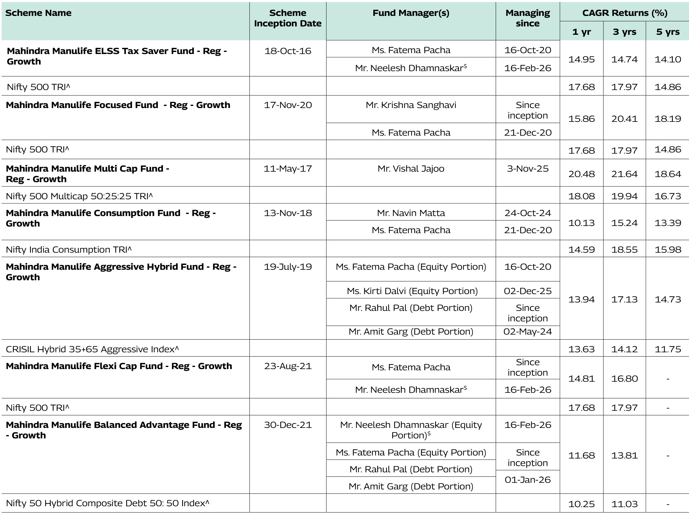Note: As February 28, 2026 was a non-business days, the schemes returns disclosed are as on February 27, 2026, except for Mahindra Manulife Liquid Fund and Mahindra Manulife Overnight Fund