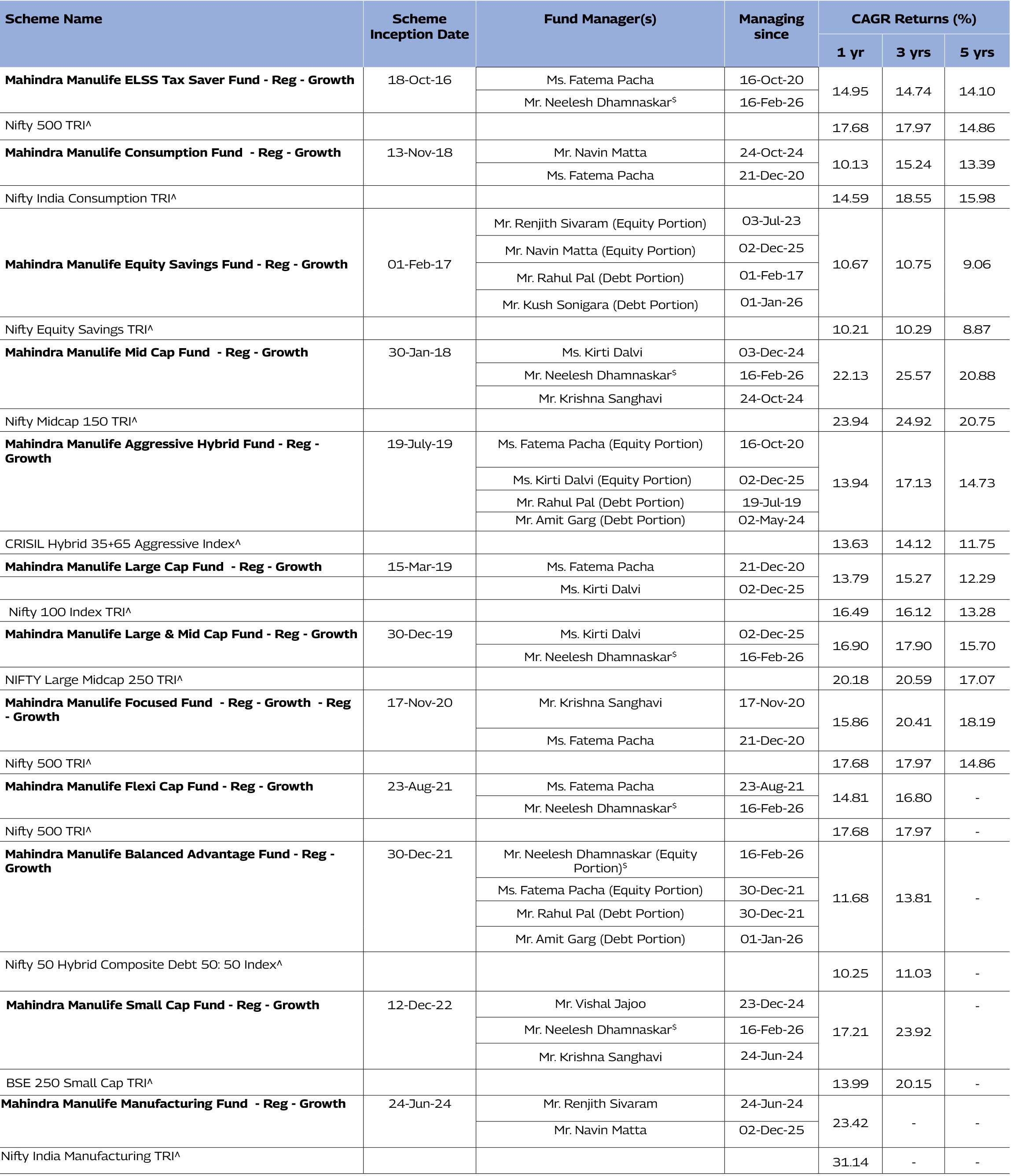 manages 8 schemes each of Mahindra Manulife Mutual Fund. The performance data for the schemes which have not completed one year has not been provided.