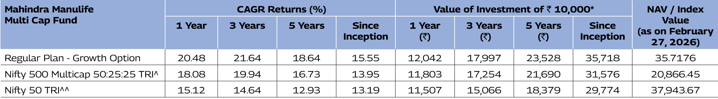 Note: As February 28, 2026 was a non-business days, the schemes returns disclosed are as on February 27, 2026, except for Mahindra Manulife Liquid Fund and Mahindra Manulife Overnight Fund
