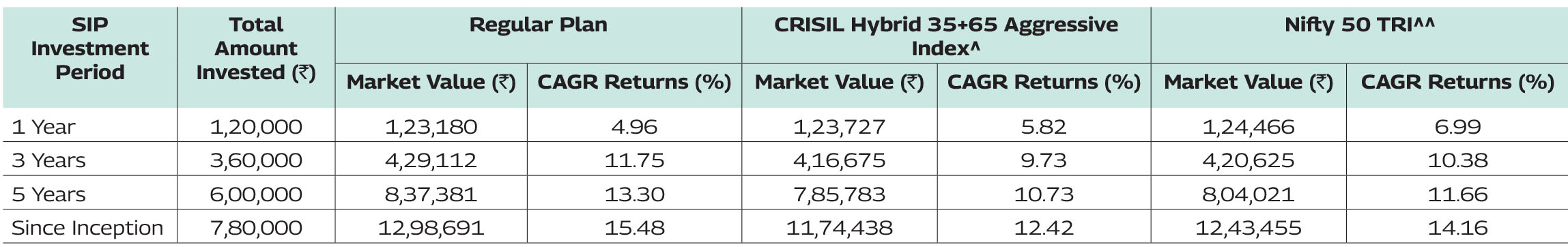 Since inception returns of the scheme is calculated on face value of Rs. 10 invested at inception. The performance details provided above are of Growth Option under Regular Plan. Different Plans i.e Regular Plan and Direct Plan under the scheme has different expense structure. *Based on standard investment of Rs. 10,000 made at the beginning of the relevant period. Ms. Fatema Pacha is managing this scheme since October 16, 2020. Ms. Kirti Dalvi is managing this scheme since December 2, 2025. Mr. Amit Garg is managing the scheme since May 02, 2024.