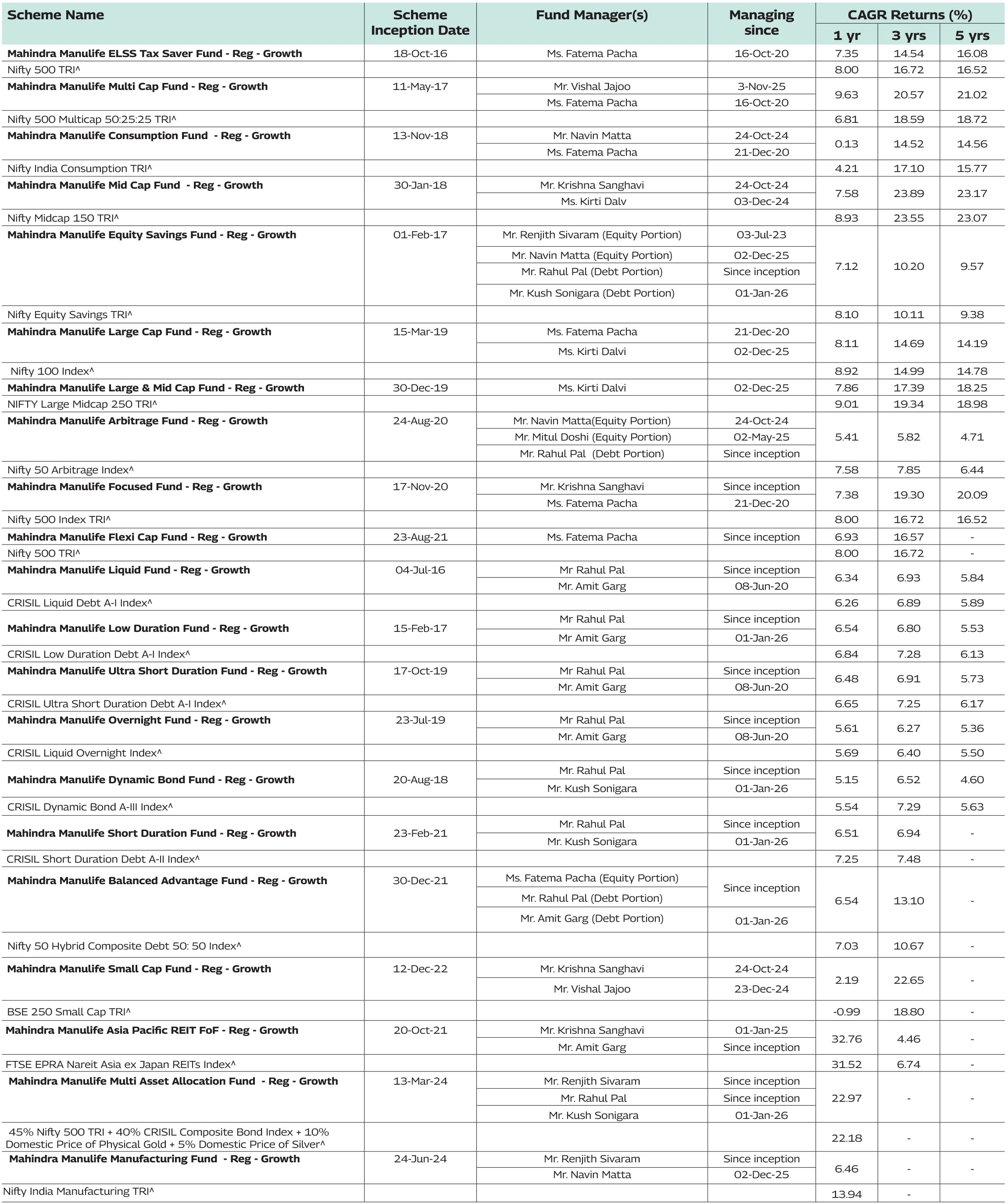 Note: As January 31, 2026 was a non-business days, the schemes returns disclosed are as on January 30, 2026, except for Mahindra Manulife Liquid Fund and Mahindra Manulife Overnight Fund which is as of January 31, 2026.