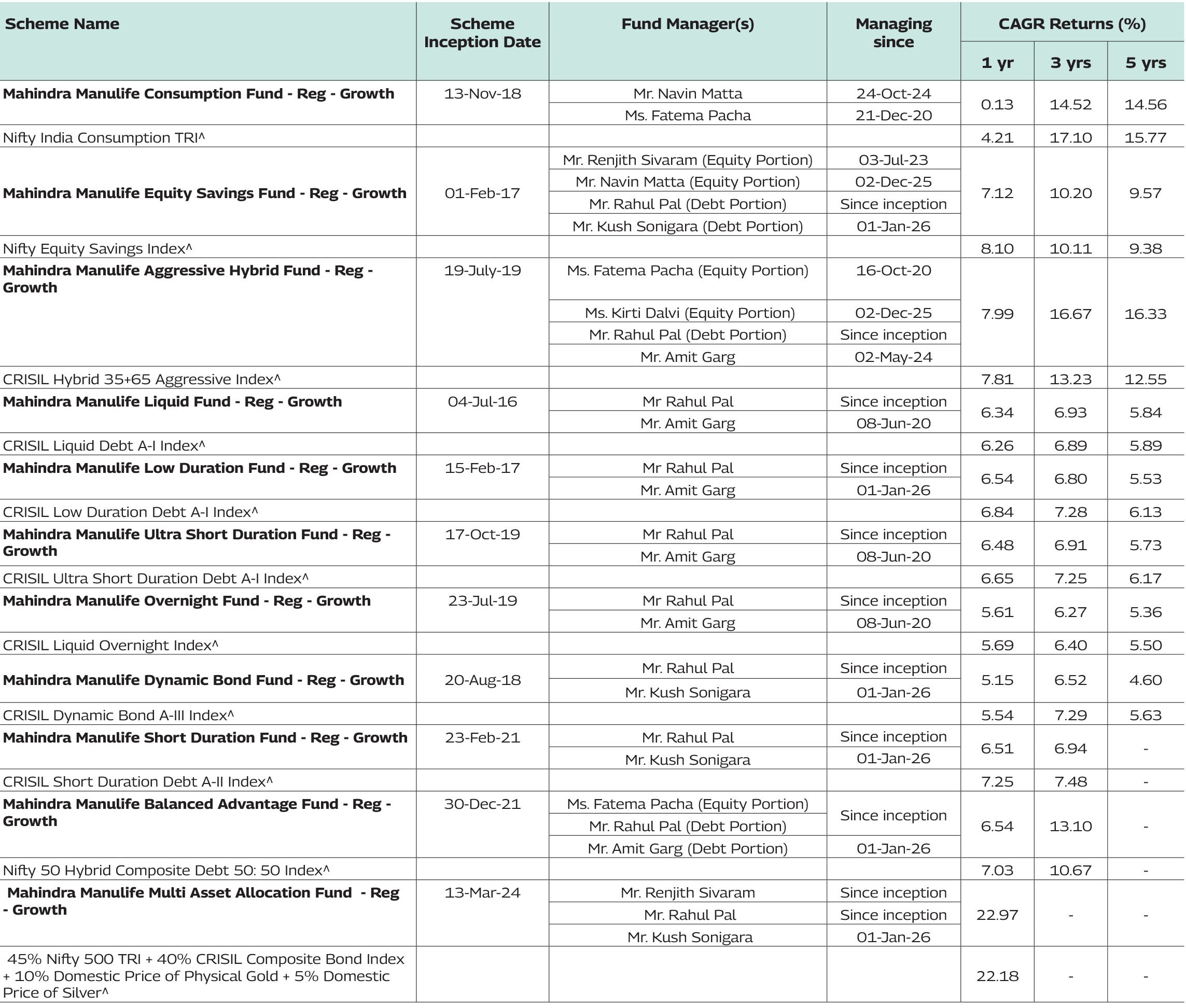 Note: As January 31, 2026 was a non-business days, the schemes returns disclosed are as on January 30, 2026, except for Mahindra Manulife Liquid Fund and Mahindra Manulife Overnight Fund which is as of January 31, 2026.
