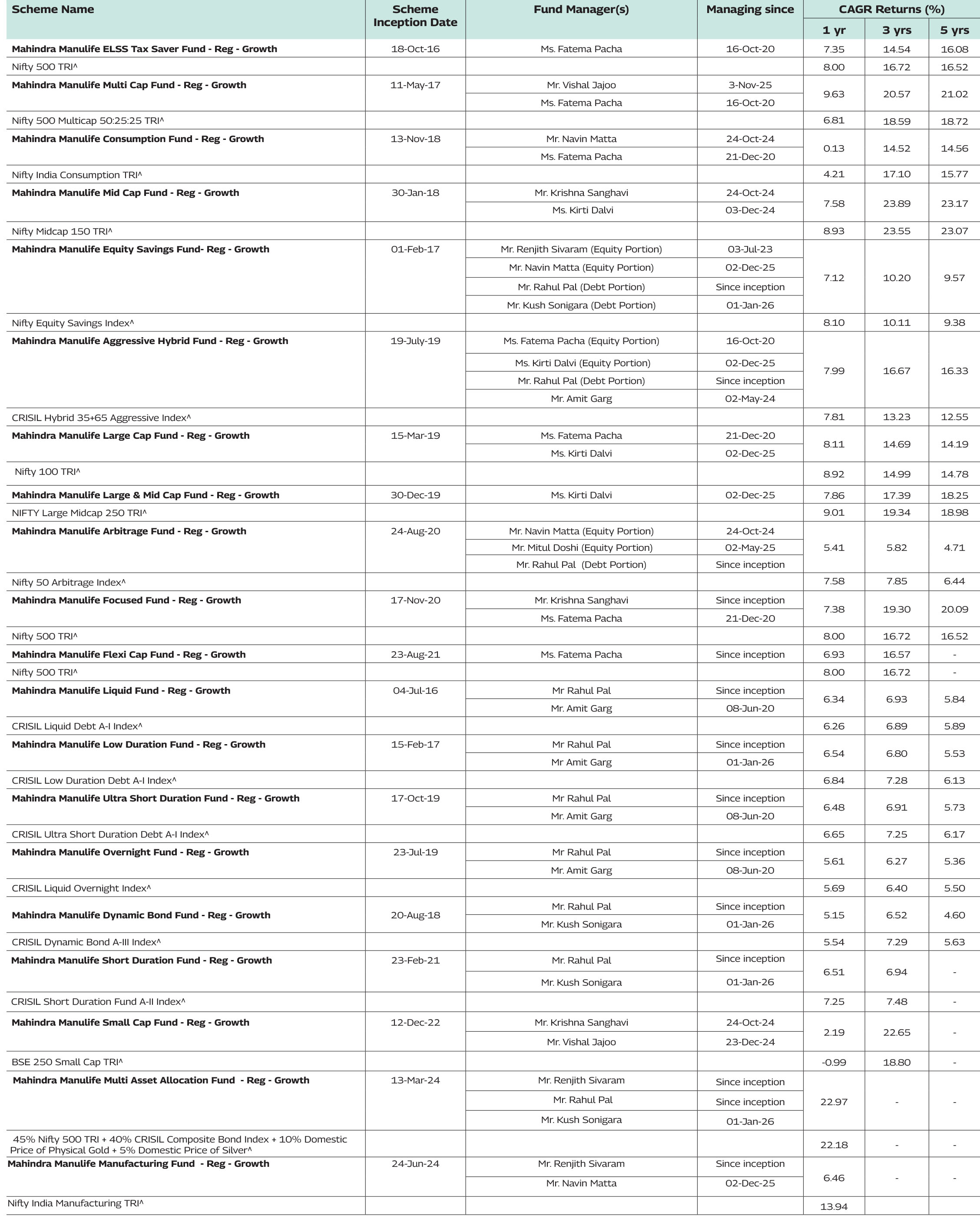 Note: As January 31, 2026 was a non-business days, the schemes returns disclosed are as on January 30, 2026, except for Mahindra Manulife Liquid Fund and Mahindra Manulife Overnight Fund which is as of January 31, 2026.
