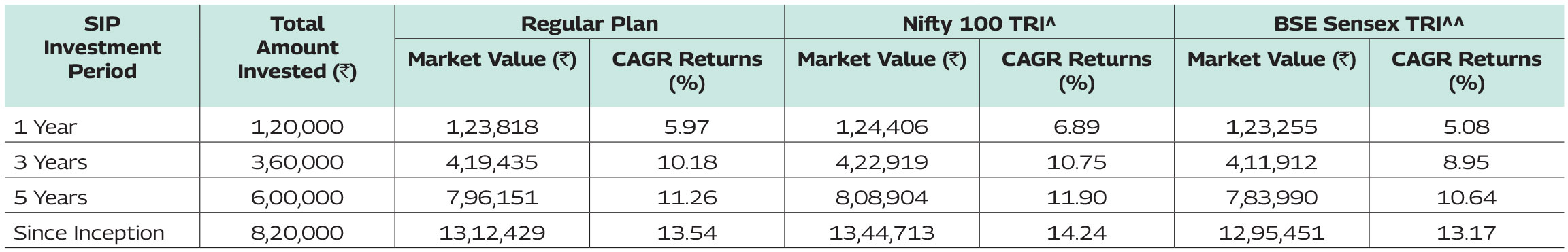 Since inception returns of the scheme is calculated on face value of Rs. 10 invested at inception. The performance details provided above are of Growth Option under Regular Plan. Different Plans i.e Regular Plan and Direct Plan under the scheme has different expense structure. Ms. Fatema Pacha is managing this scheme since December 21, 2020. Ms. Kirti Dalvi is managing this scheme since December 2, 2025. *Based on standard investment of Rs. 10,000 made at the beginning of the relevant period.