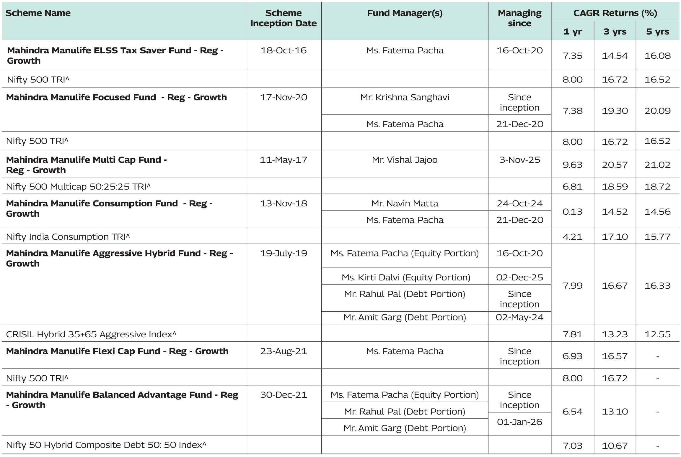 The performance details provided above are of Growth Option under Regular Plan. Different Plans i.e Regular Plan and Direct Plan under the scheme has different expense structure. Ms. Fatema Pacha manages 6 schemes and Ms. Kirti Dalvi is managing 1 scheme of Mahindra Manulife Mutual Fund. The performance data for the schemes which have not completed one year has not been provided.