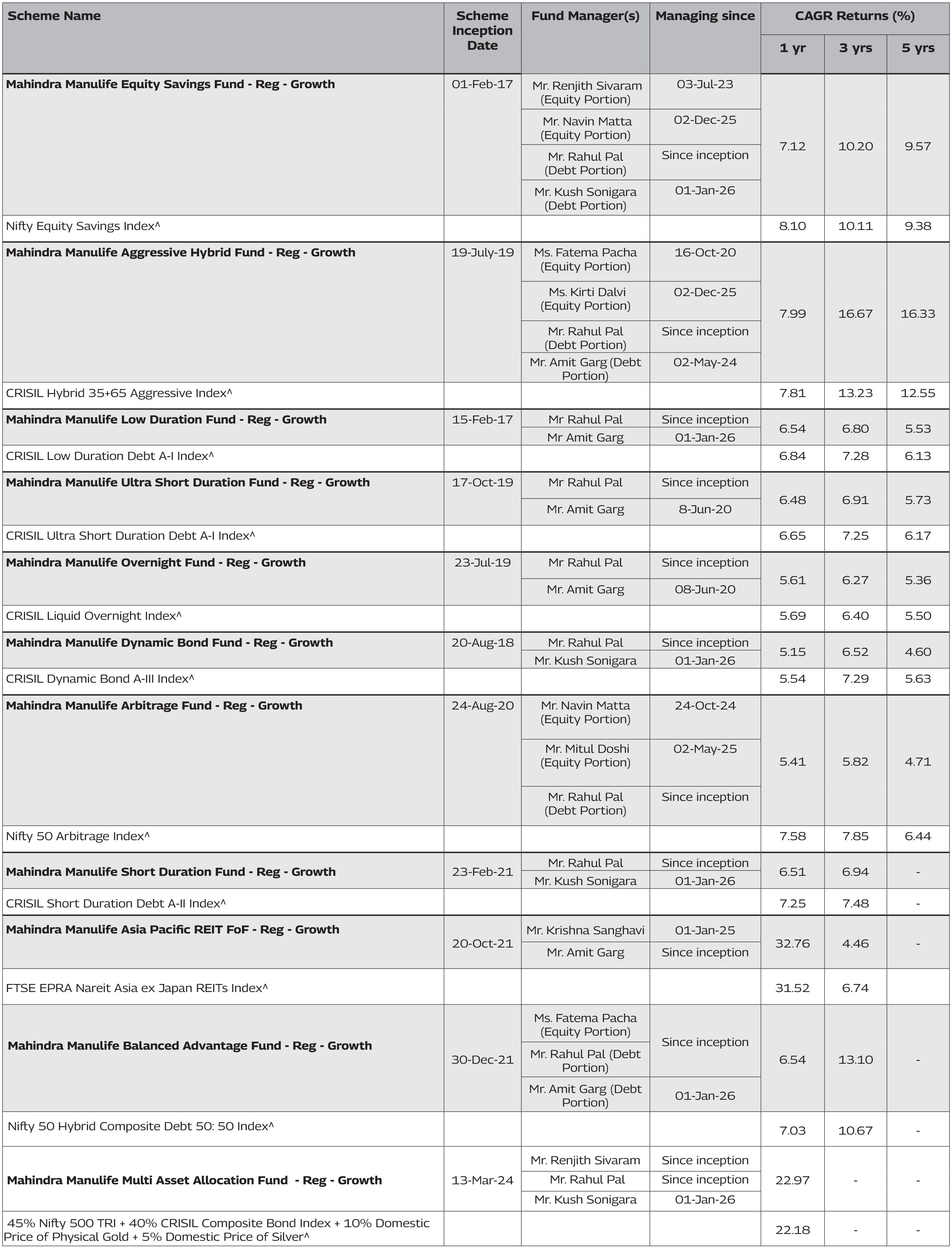 Note: As January 31, 2026 was a non-business days, the schemes returns disclosed are as on January 30, 2026, except for Mahindra Manulife Liquid Fund and Mahindra Manulife Overnight Fund which is as of January 31, 2026.