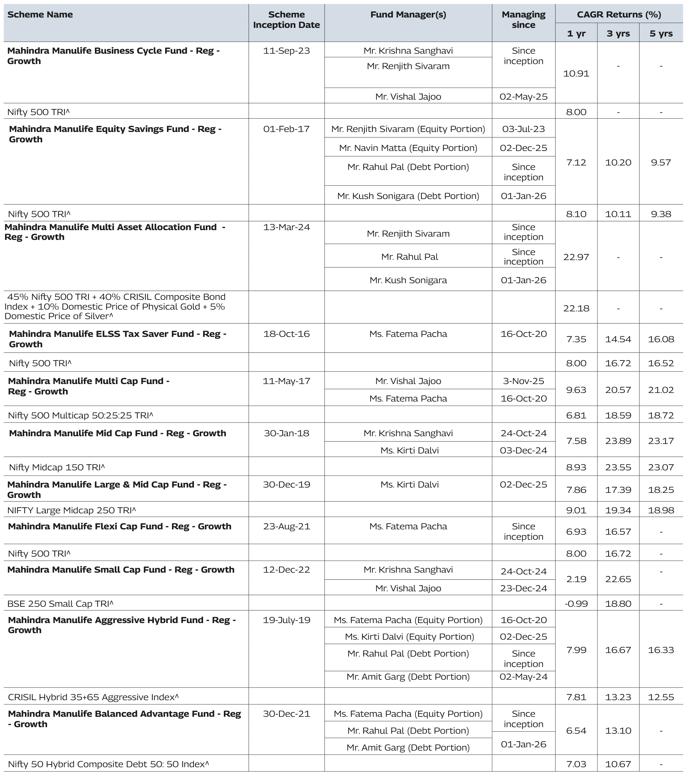 Note: As January 31, 2026 was a non-business days, the schemes returns disclosed are as on January 30, 2026, except for Mahindra Manulife Liquid Fund and Mahindra Manulife Overnight Fund which