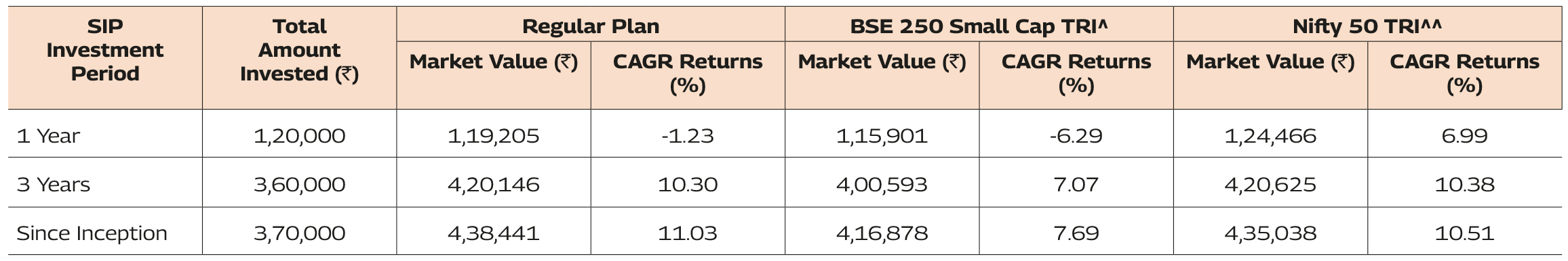 Past performance may or may not be sustained in future and should not be used as a basis of comparison with other investments. Returns greater than 1 year period are compounded annualized. For SIP returns, monthly investment of equal amounts invested on the 1st business day of every month has been considered. CAGR Returns (%) are computed after accounting for the cash flow by using the XIRR method (investment internal rate of return).