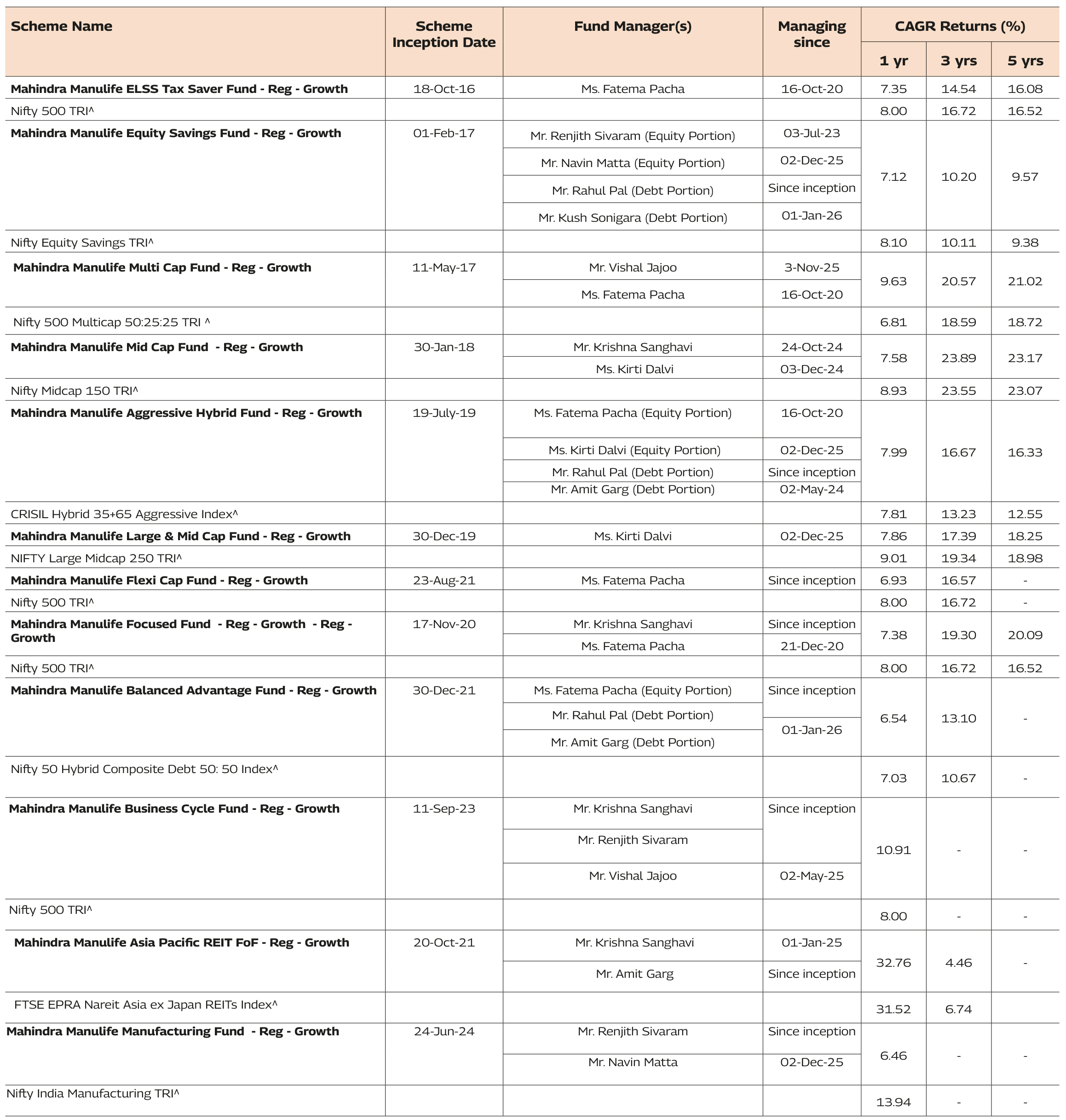 The performance details provided above are of Growth Option under Regular Plan. Different Plans i.e Regular Plan and Direct Plan under the scheme has different expense structure. Mr. Krishna Sanghavi manages 5 schemes and Mr. Vishal Jajoo manages 3 schemes each of Mahindra Manulife Mutual Fund. The performance data for the schemes which have not completed one year has not been provided.