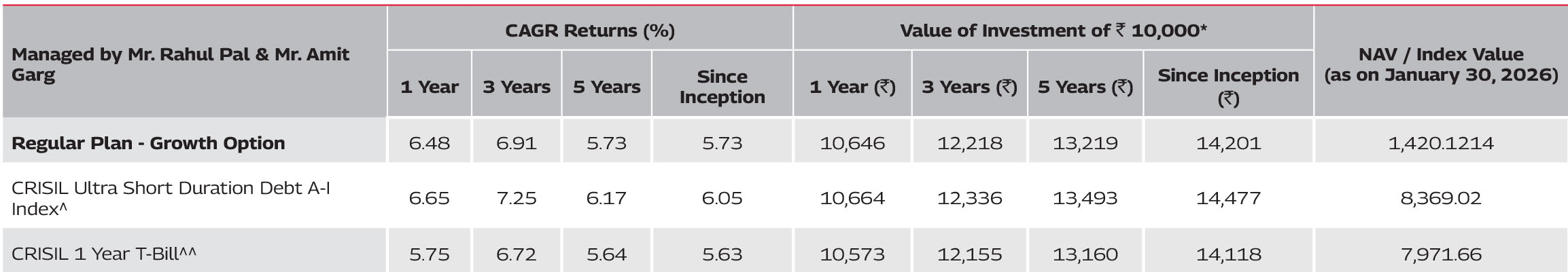 Since inception returns of the scheme is calculated on face value of Rs. 1,000 invested at inception. The performance details provided above are of Growth Option under Regular Plan. Different Plans i.e Regular Plan and Direct Plan under the scheme has different expense structure. *Based on standard investment of Rs. 10,000 made at the beginning of the relevant period. Mr Amit Garg is managing this scheme since June 8, 2020.
