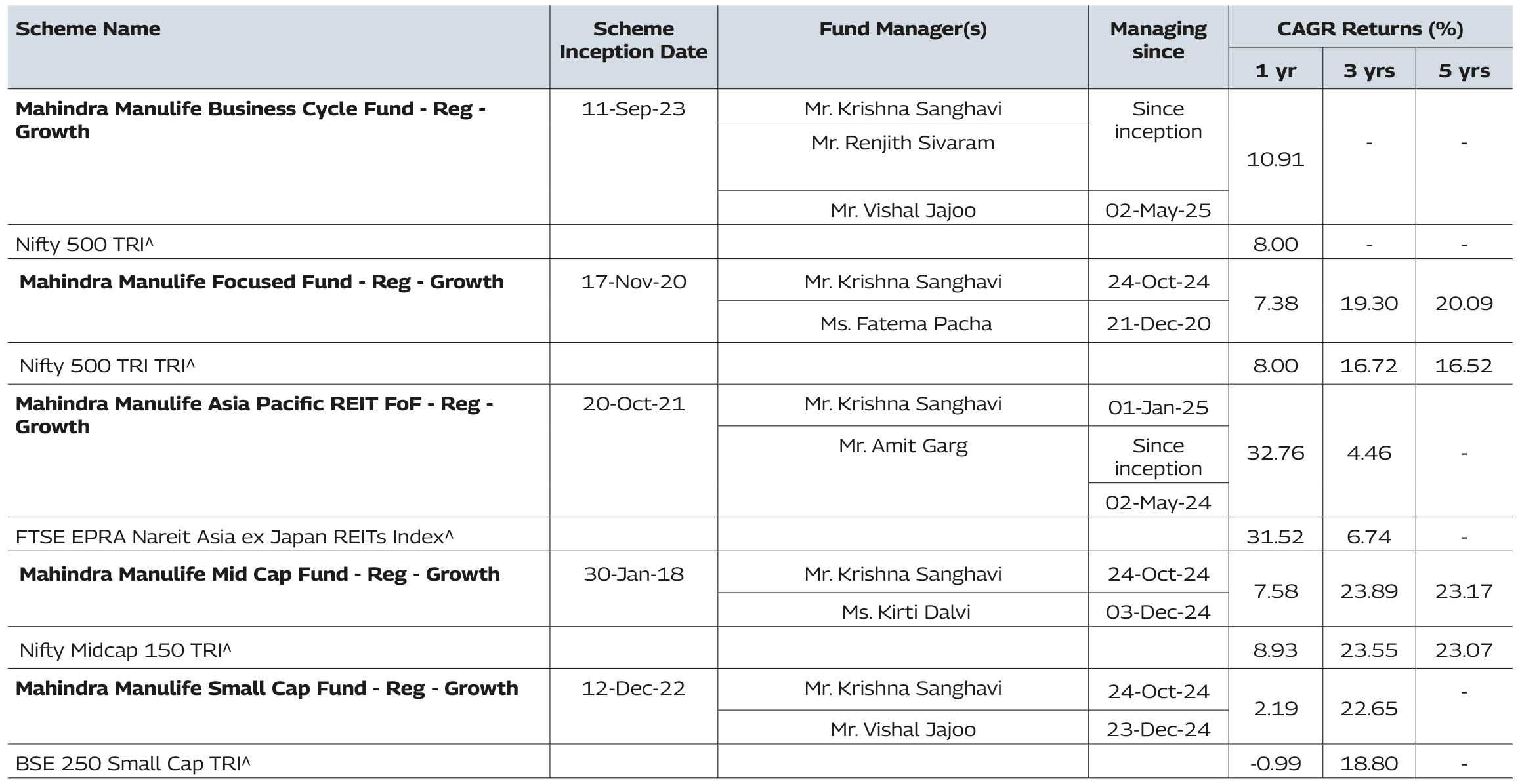 Note: The performance data of Mahindra Manulife Banking & Financial Services Fund has not been provided as the scheme has not completed 1 year since inception. The said Scheme is managed by Mr. Vishal Jajoo & Mr. Chetan Sanjay Gindodia.