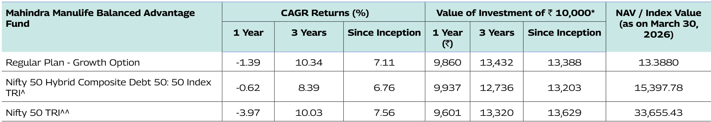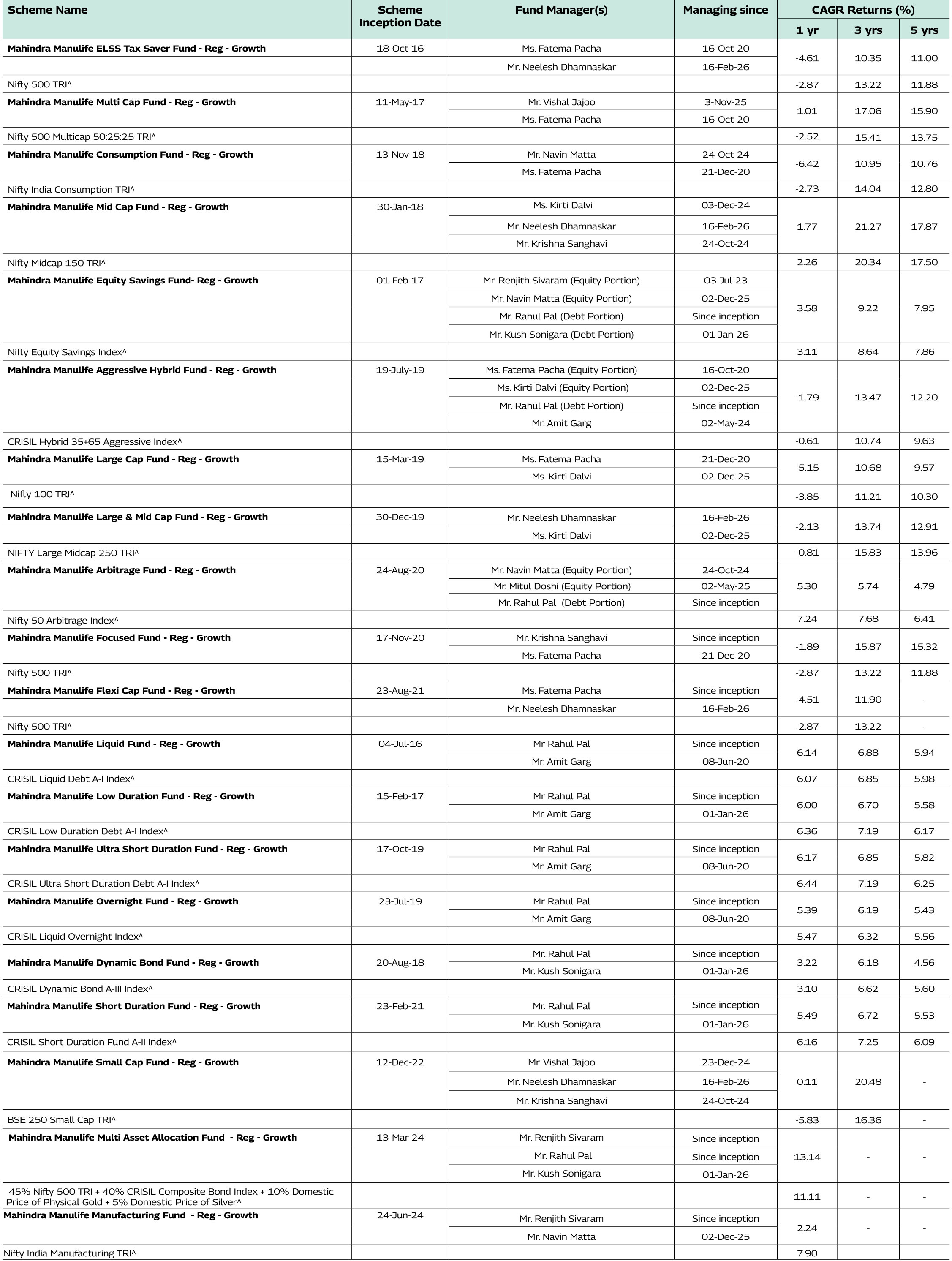 Note: As March 31, 2026 was a non-business days, the schemes returns disclosed are as on March 31, 2026, except for Mahindra Manulife Liquid Fund and Mahindra Manulife Overnight Fund which is as of March 31, 2026.