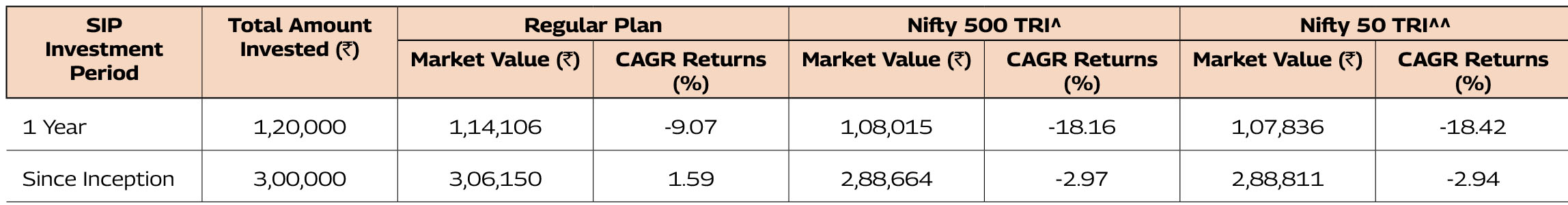 ^Benchmark ^^Additional Benchmark. CAGR – Compounded Annual Growth Rate. Inception/Allotment date: 11-Sep-23. Past performance may or may not be sustained in future and should not be used as a basis of comparison with other investments. Returns greater than 1 year period are compounded annualized. For SIP returns, monthly investment of equal amounts invested on the 1st business day of every month has been considered. CAGR Returns (%) are computed after accounting for the cash flow by using the XIRR method (investment internal rate of return).