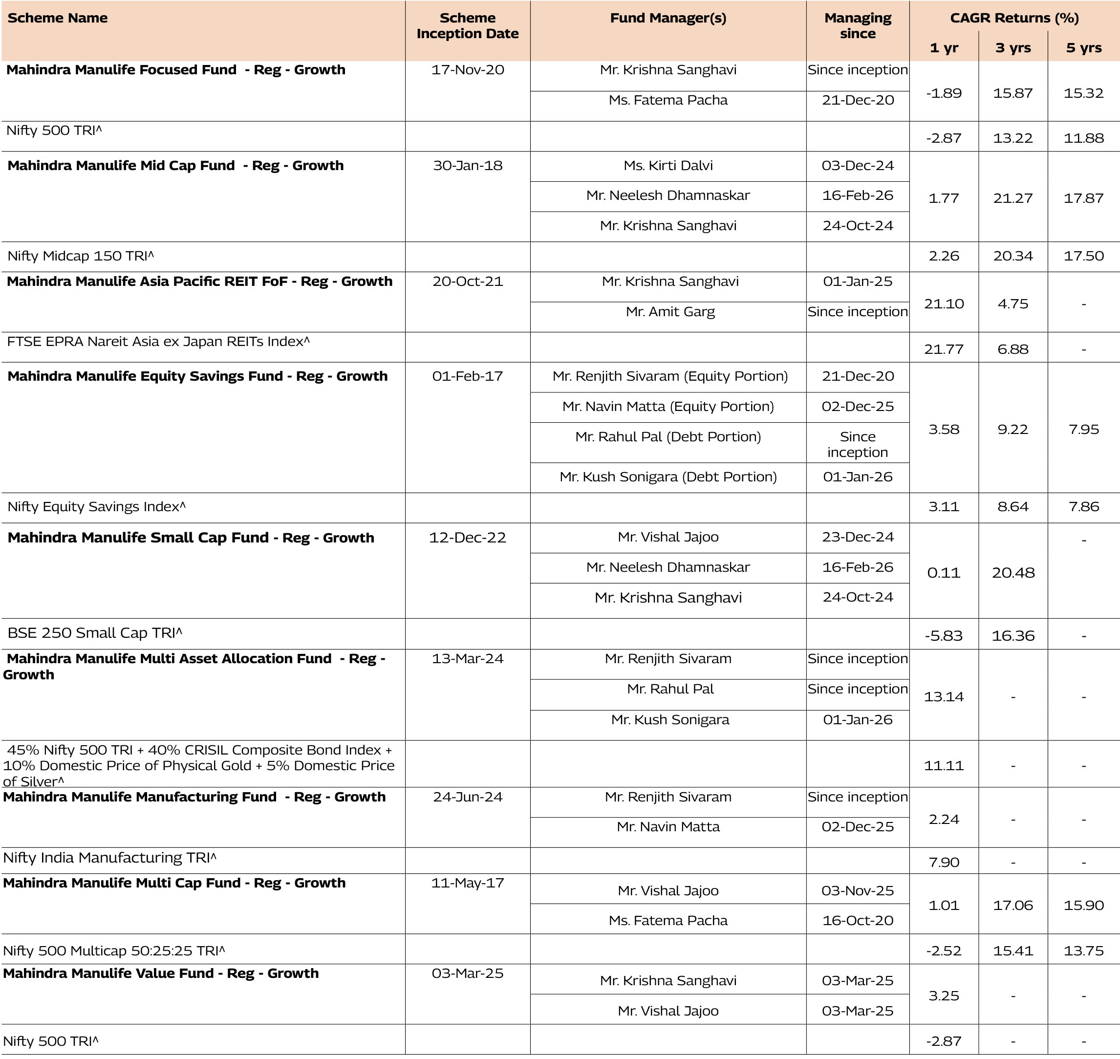Note: As March 31, 2026 was a non-business days, the schemes returns disclosed are as on March 31, 2026, except for Mahindra Manulife Liquid Fund and Mahindra Manulife Overnight Fund which is