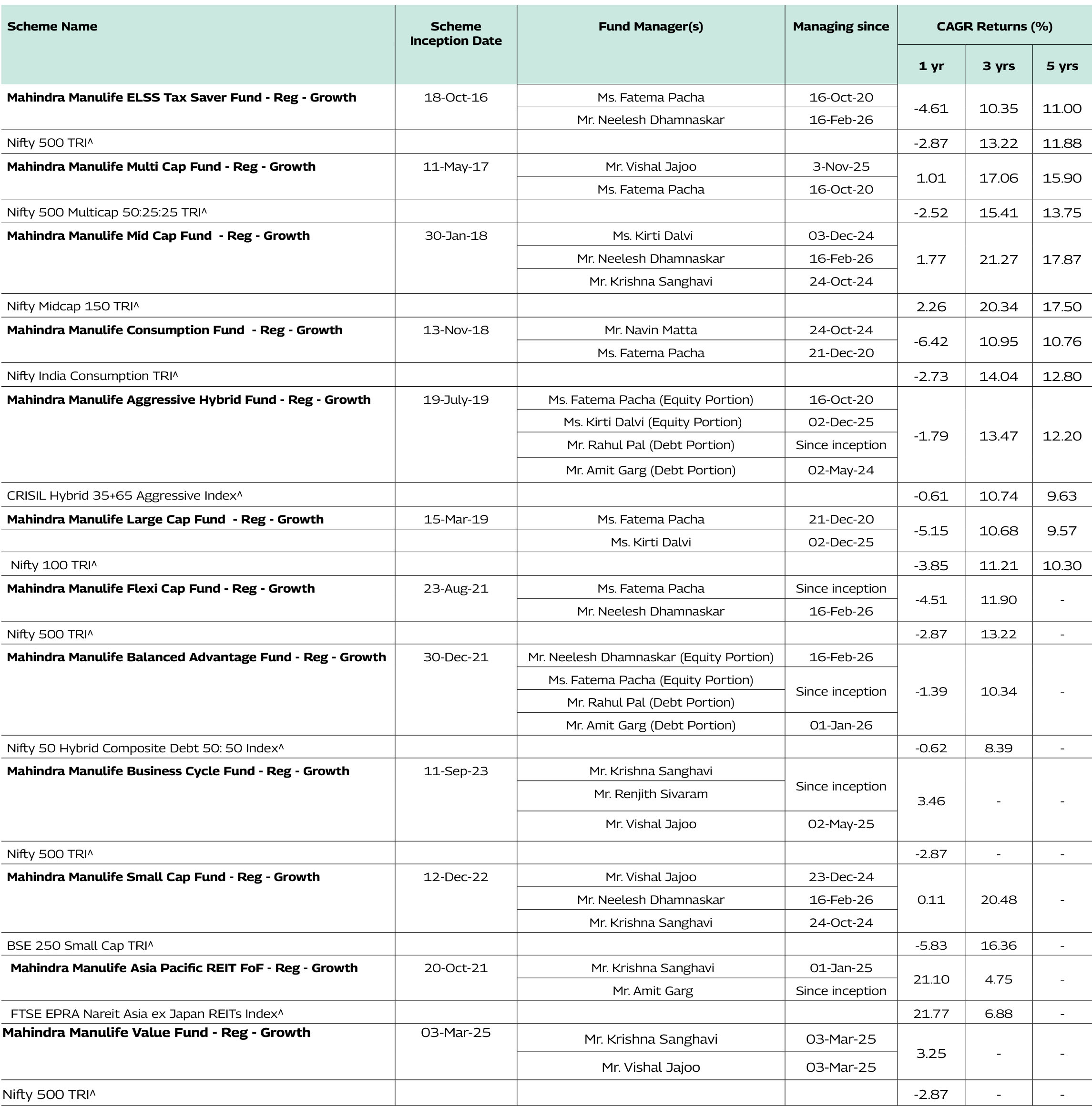 Note: As March 31, 2026 was a non-business days, the schemes returns disclosed are as on March 31, 2026, except for Mahindra Manulife Liquid Fund and Mahindra Manulife Overnight