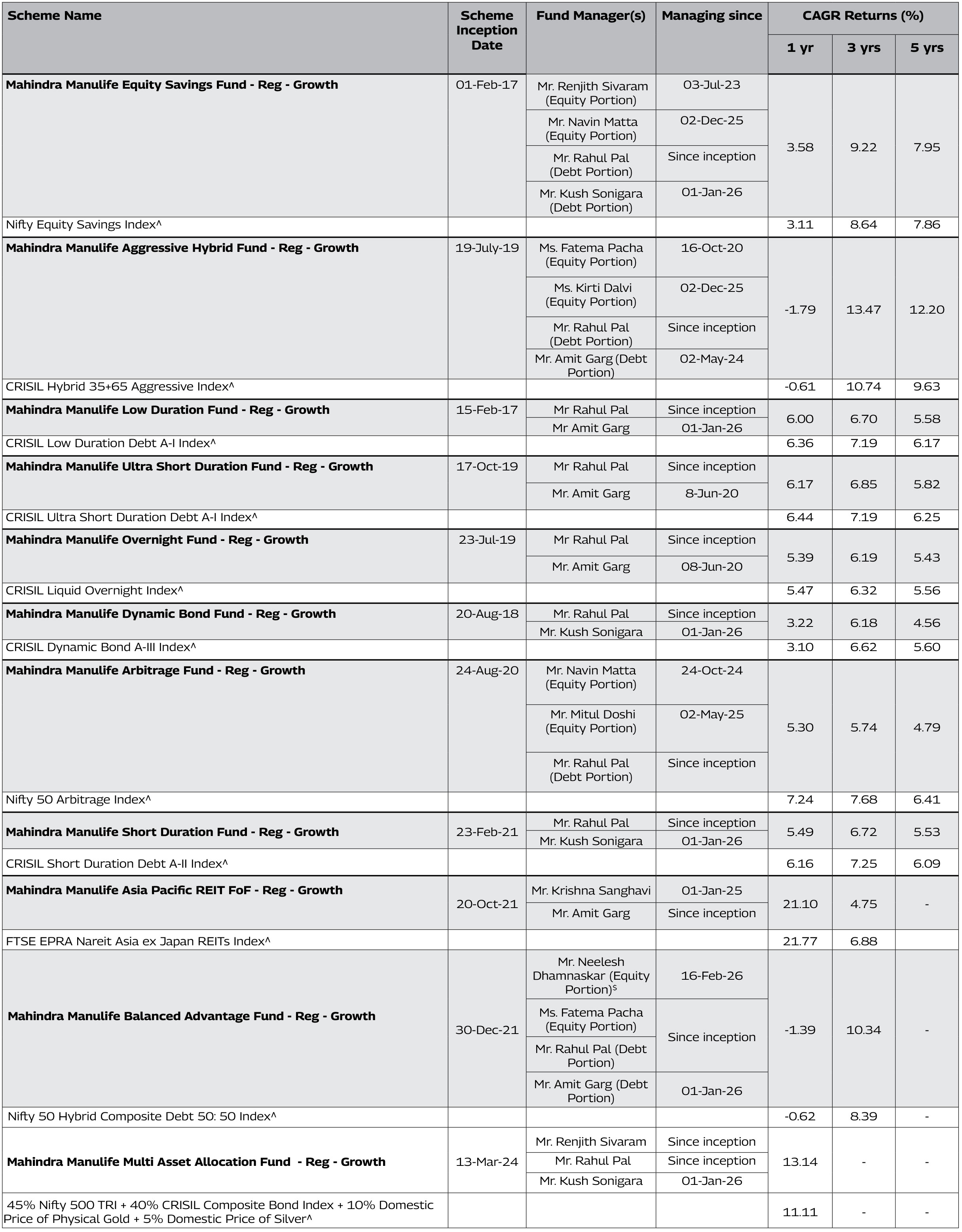 Note: As March 31, 2026 was a non-business days, the schemes returns disclosed are as on March 31, 2026, except for Mahindra Manulife Liquid Fund and Mahindra Manulife Overnight Fund which
