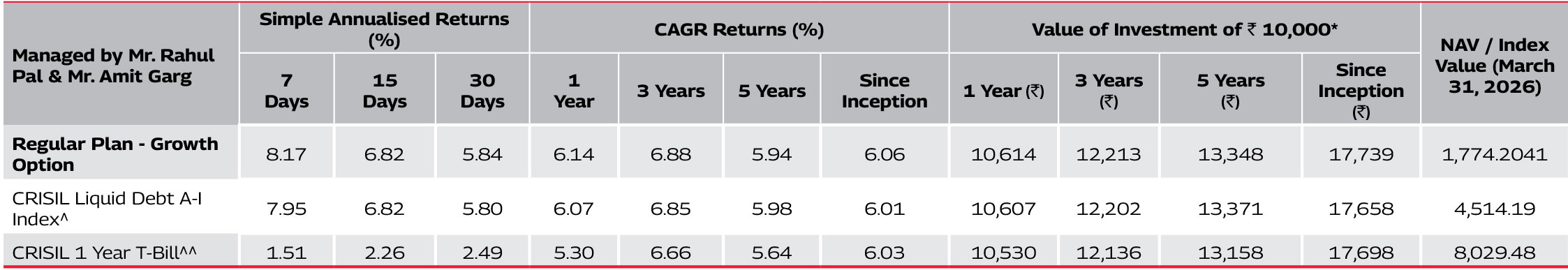 Benchmark: CRISIL Liquid Debt A-I Index| Investor Exit upon subscription | Exit Load as % of redemption proceed |