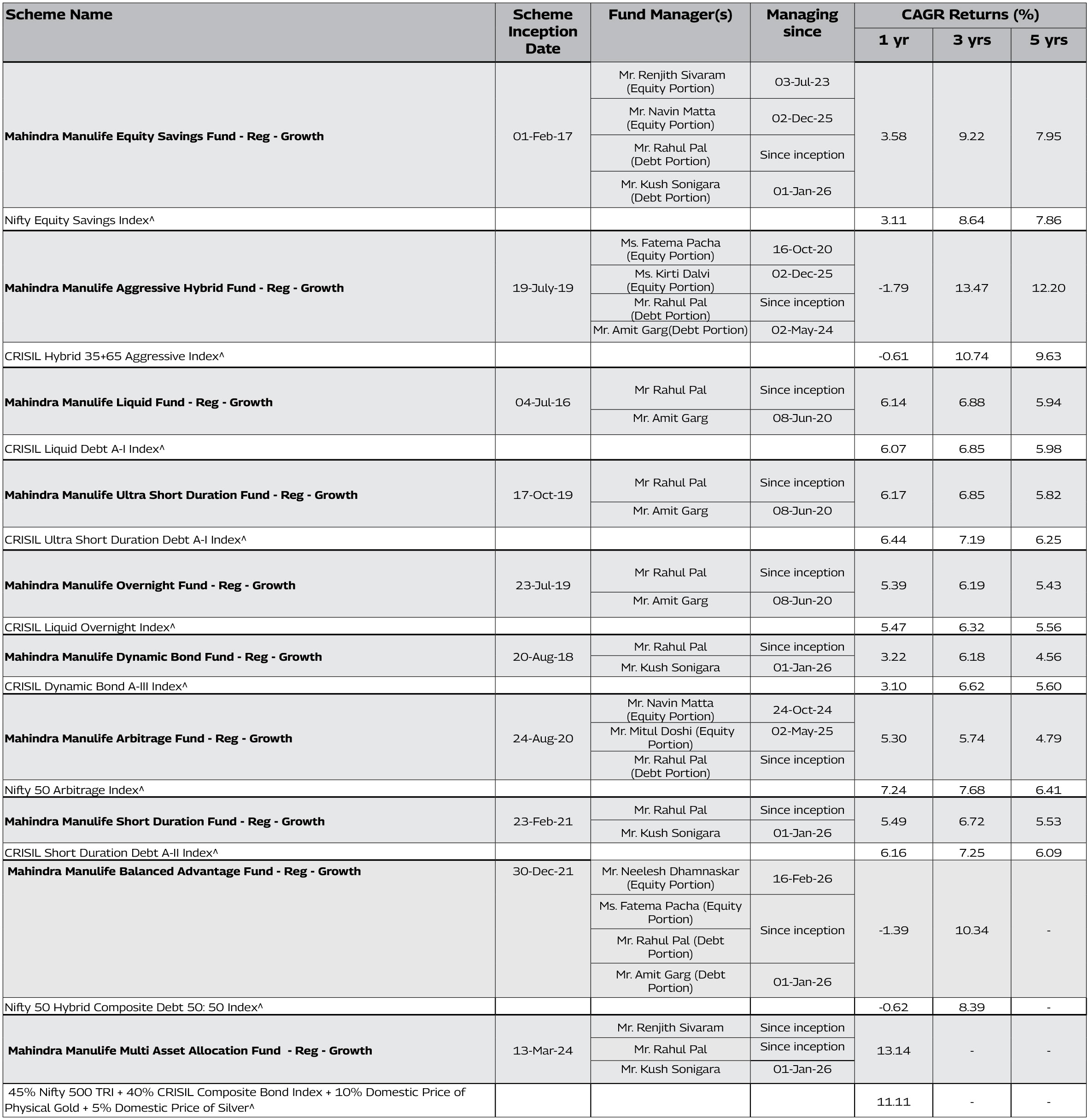 Note: As March 31, 2026 was a non-business days, the schemes returns disclosed are as on March 31, 2026, except for Mahindra Manulife Liquid Fund and Mahindra Manulife Overnight Fund which