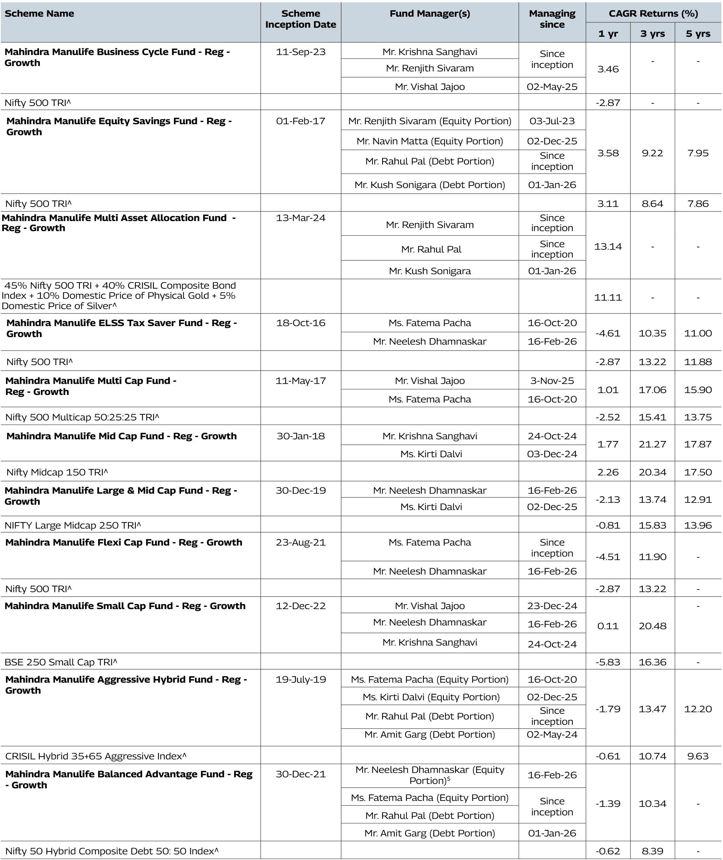 Note: As March 31, 2026 was a non-business days, the schemes returns disclosed are as on March 31, 2026, except for Mahindra Manulife Liquid Fund and Mahindra Manulife Overnight
