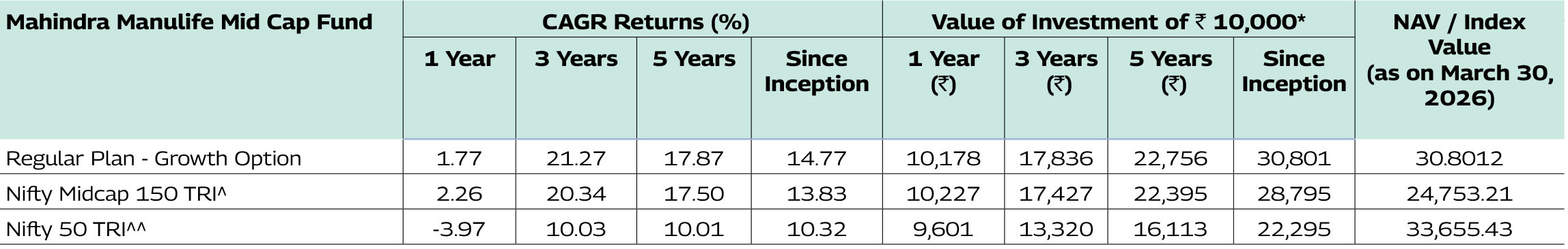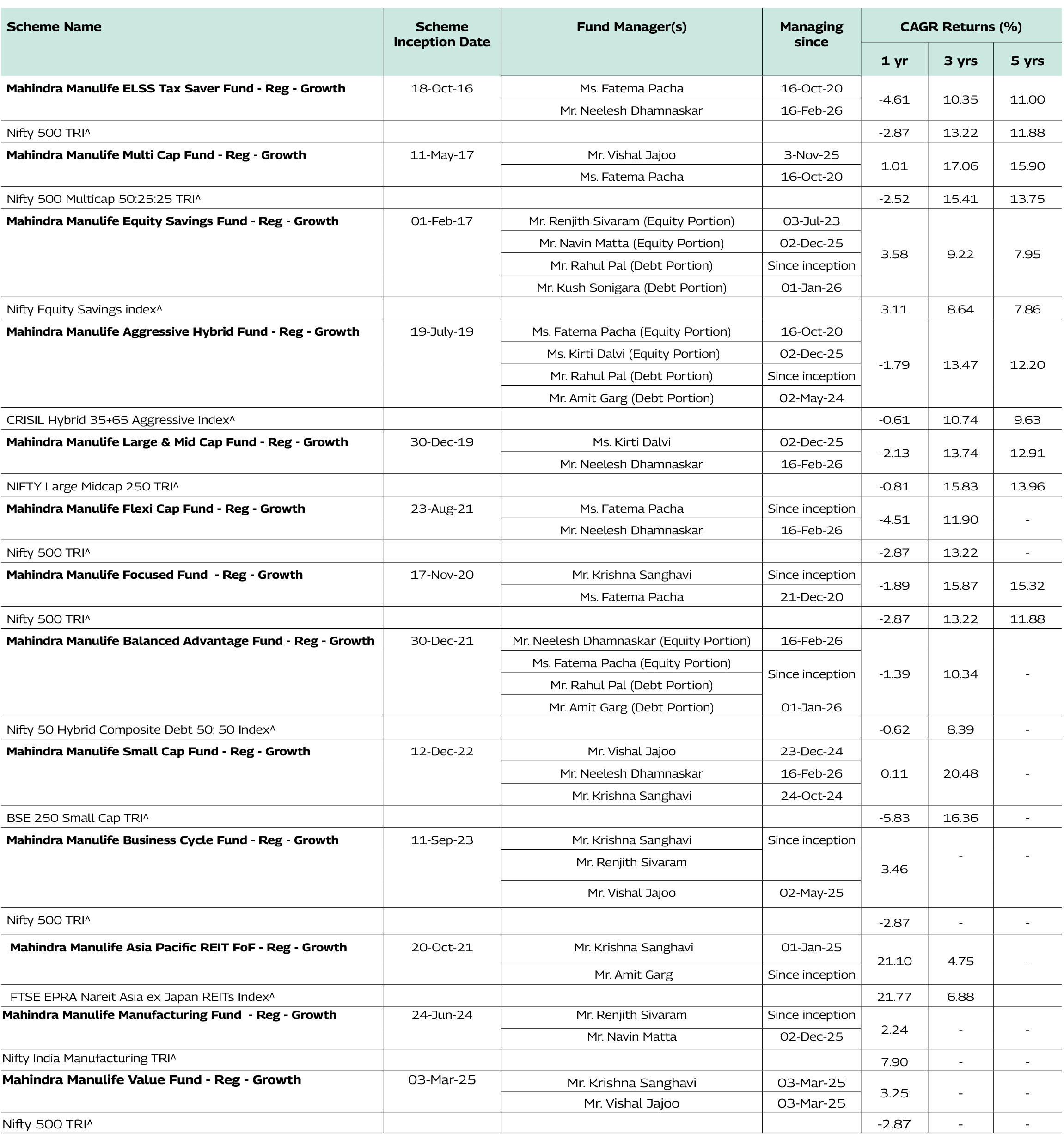 Note: As March 31, 2026 was a non-business days, the schemes returns disclosed are as on March 31, 2026, except for Mahindra Manulife Liquid Fund and Mahindra Manulife Overnight Fund which is
