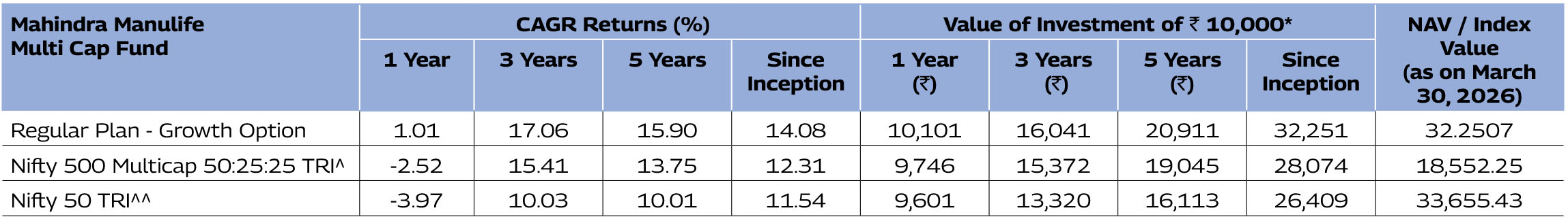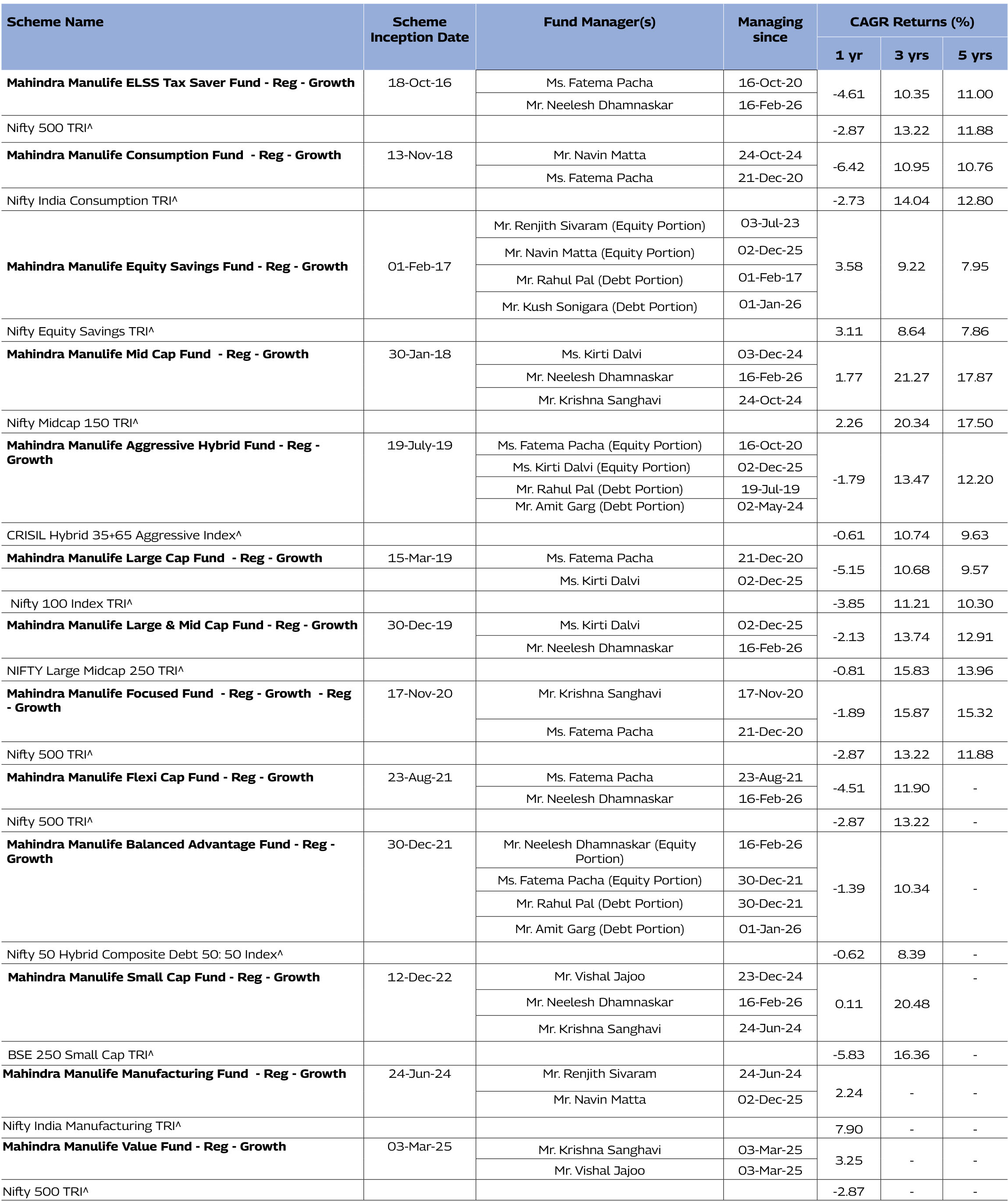 Note: As March 31, 2026 was a non-business days, the schemes returns disclosed are as on March 31, 2026, except for Mahindra Manulife Liquid Fund and Mahindra Manulife Overnight Fund which is