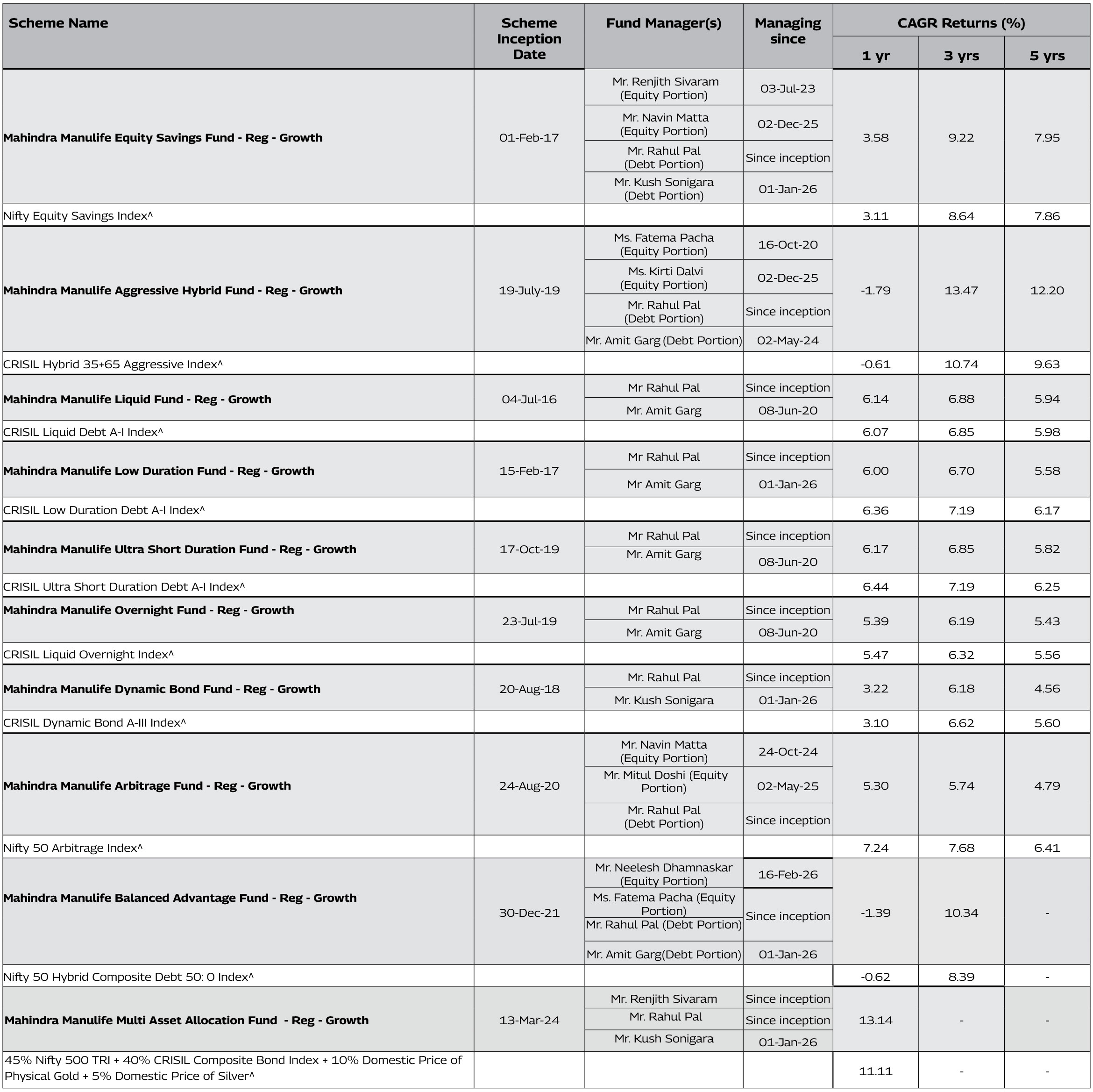 Note: As March 31, 2026 was a non-business days, the schemes returns disclosed are as on March 31, 2026, except for Mahindra Manulife Liquid Fund and Mahindra Manulife Overnight Fund which is as of March