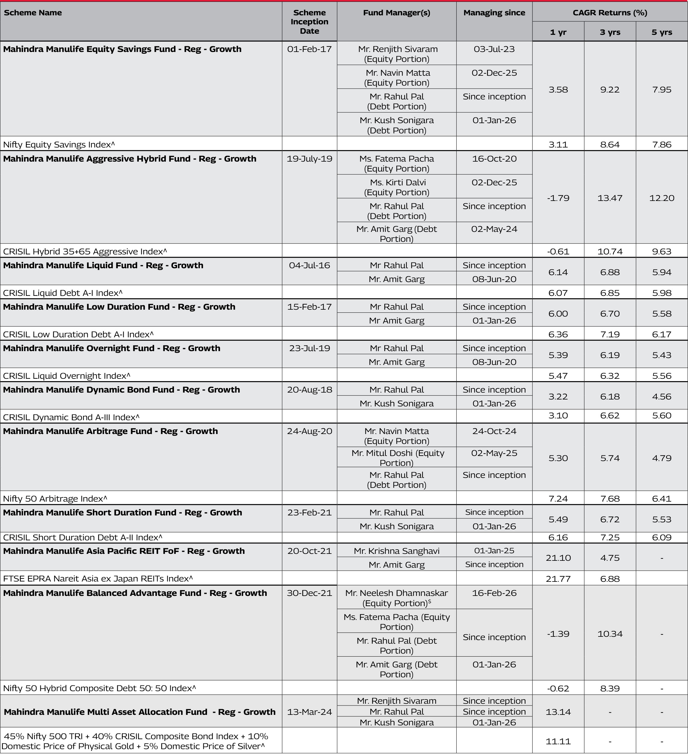 Note: As March 31, 2026 was a non-business days, the schemes returns disclosed are as on March 31, 2026, except for Mahindra Manulife Liquid Fund and Mahindra Manulife Overnight Fund which is as of March