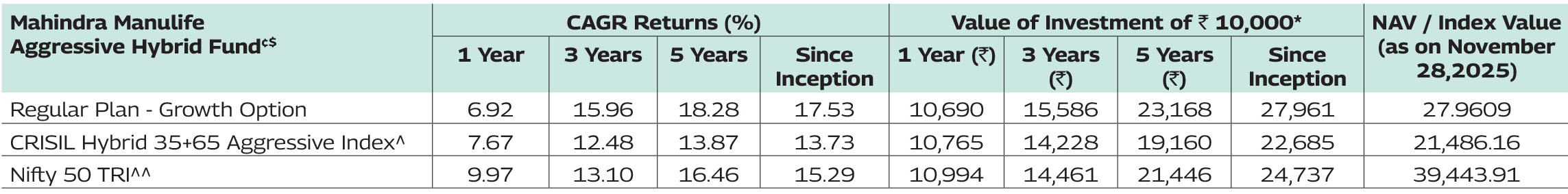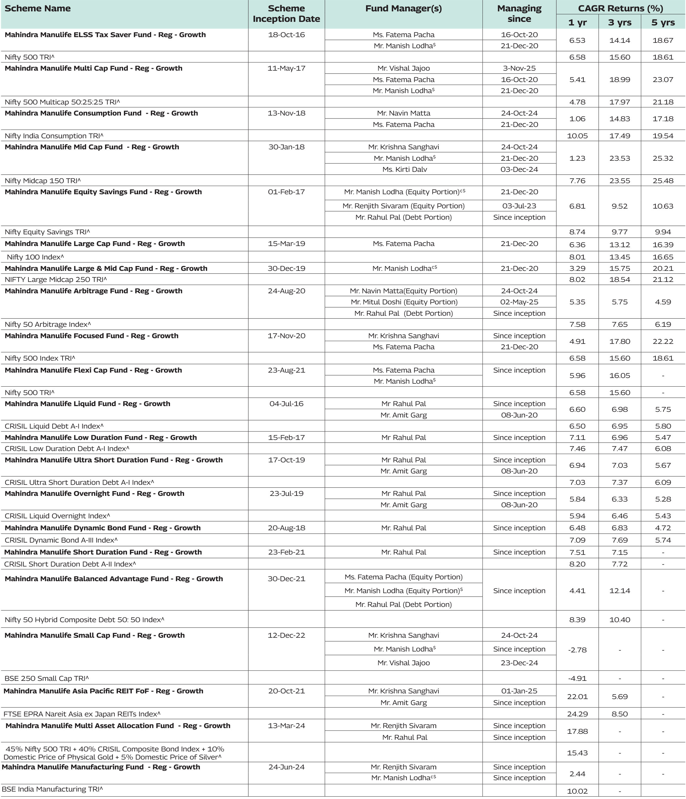 Note: As November 29 & 30, 2025 was a non-business days, the schemes returns disclosed are as on November 28, 2025, except for Mahindra Manulife Liquid Fund and Mahindra Manulife Overnight Fund which is as of November 30, 2025.