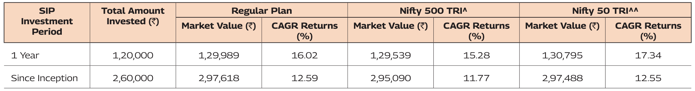 ^Benchmark ^^Additional Benchmark. CAGR – Compounded Annual Growth Rate. Inception/Allotment date: 11-Sep-23. Past performance may or may not be sustained in future and should not be used as a basis of comparison with other investments. Returns greater than 1 year period are compounded annualized. For SIP returns, monthly investment of equal amounts invested on the 1st business day of every month has been considered. CAGR Returns (%) are computed after accounting for the cash flow by using the XIRR method (investment internal rate of return).