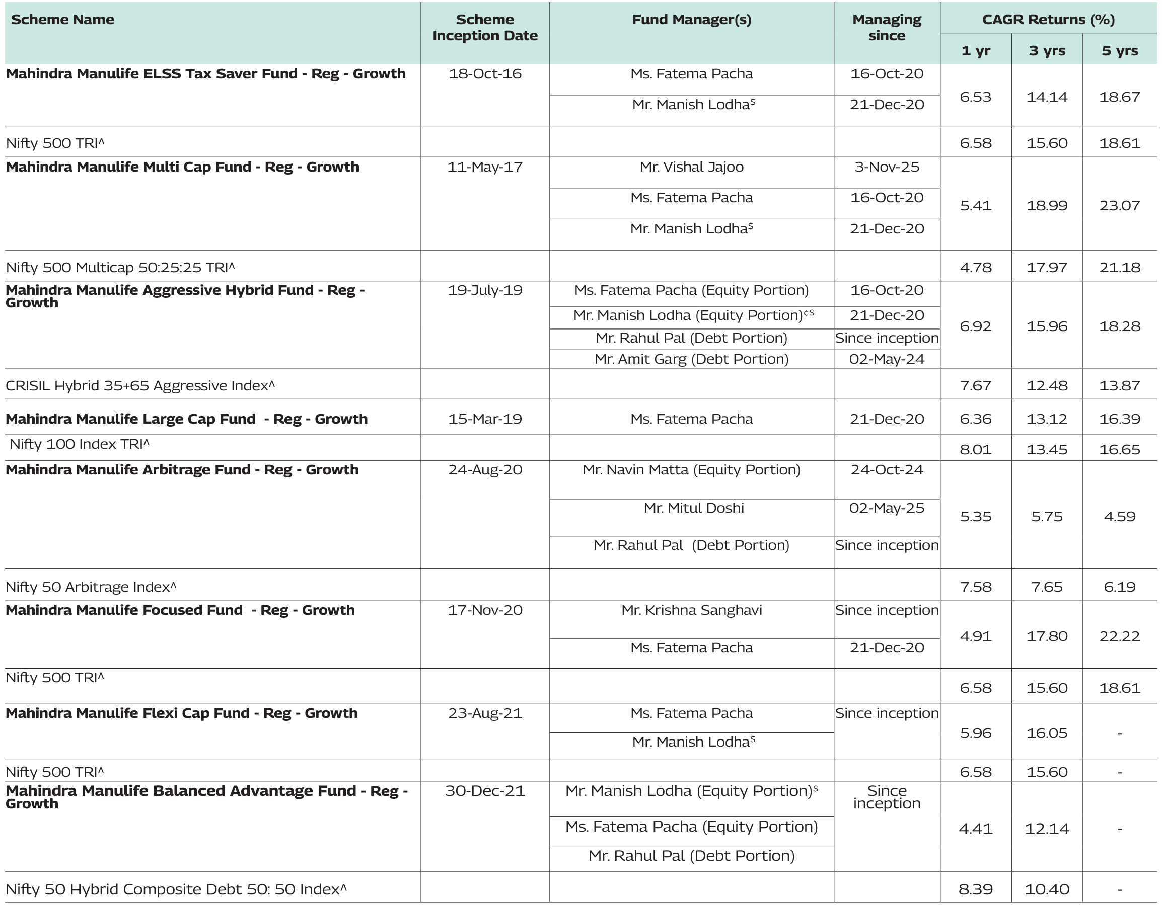 Note: As November 29 & 30, 2025 was a non-business days, the schemes returns disclosed are as on November 28, 2025, except for Mahindra Manulife Liquid Fund and Mahindra Manulife Overnight Fund which is as of November 30, 2025.