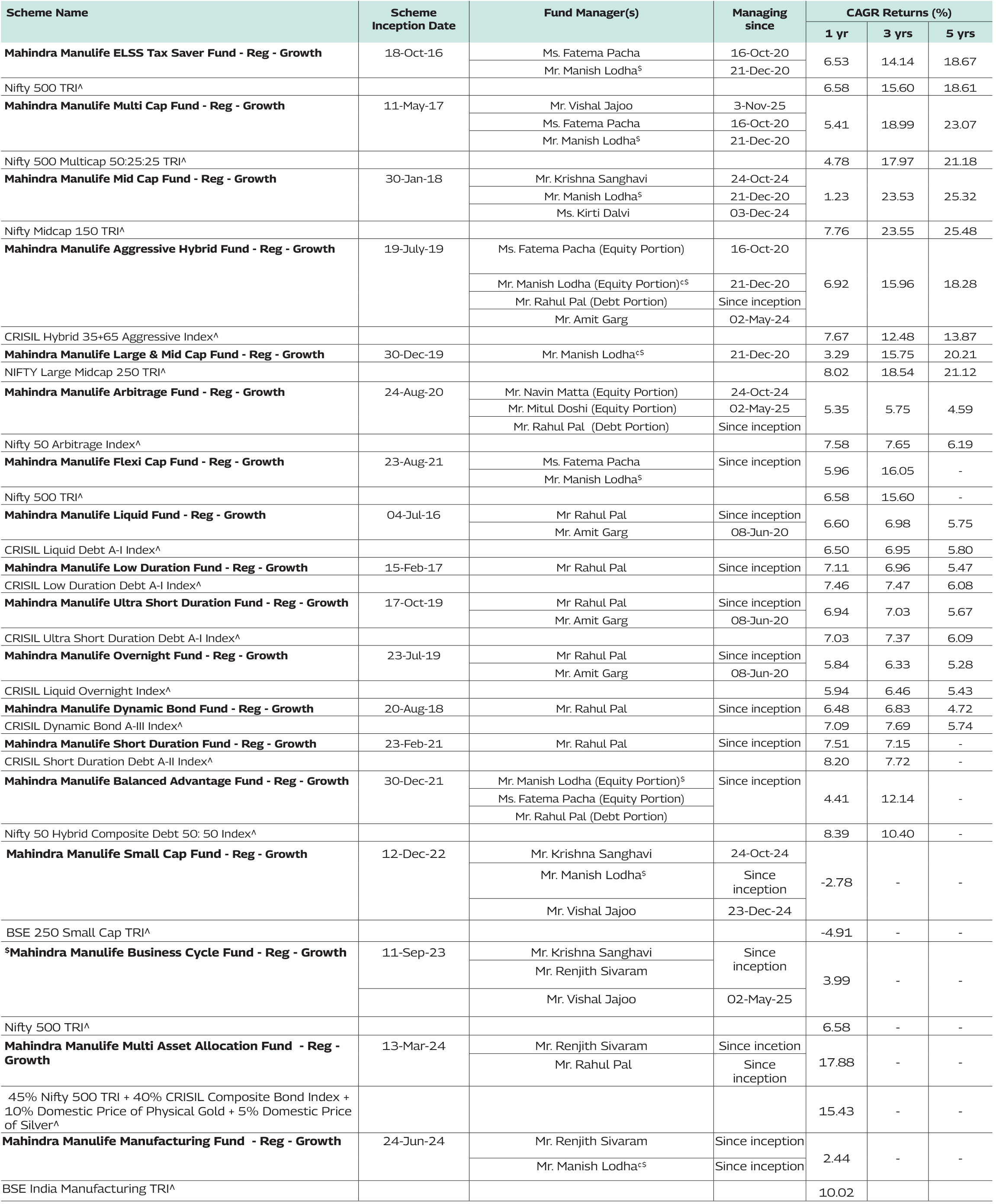 Note: As November 29 & 30, 2025 was a non-business days, the schemes returns disclosed are as on November 28, 2025, except for Mahindra Manulife Liquid Fund and Mahindra Manulife Overnight Fund which is as of November 30, 2025.