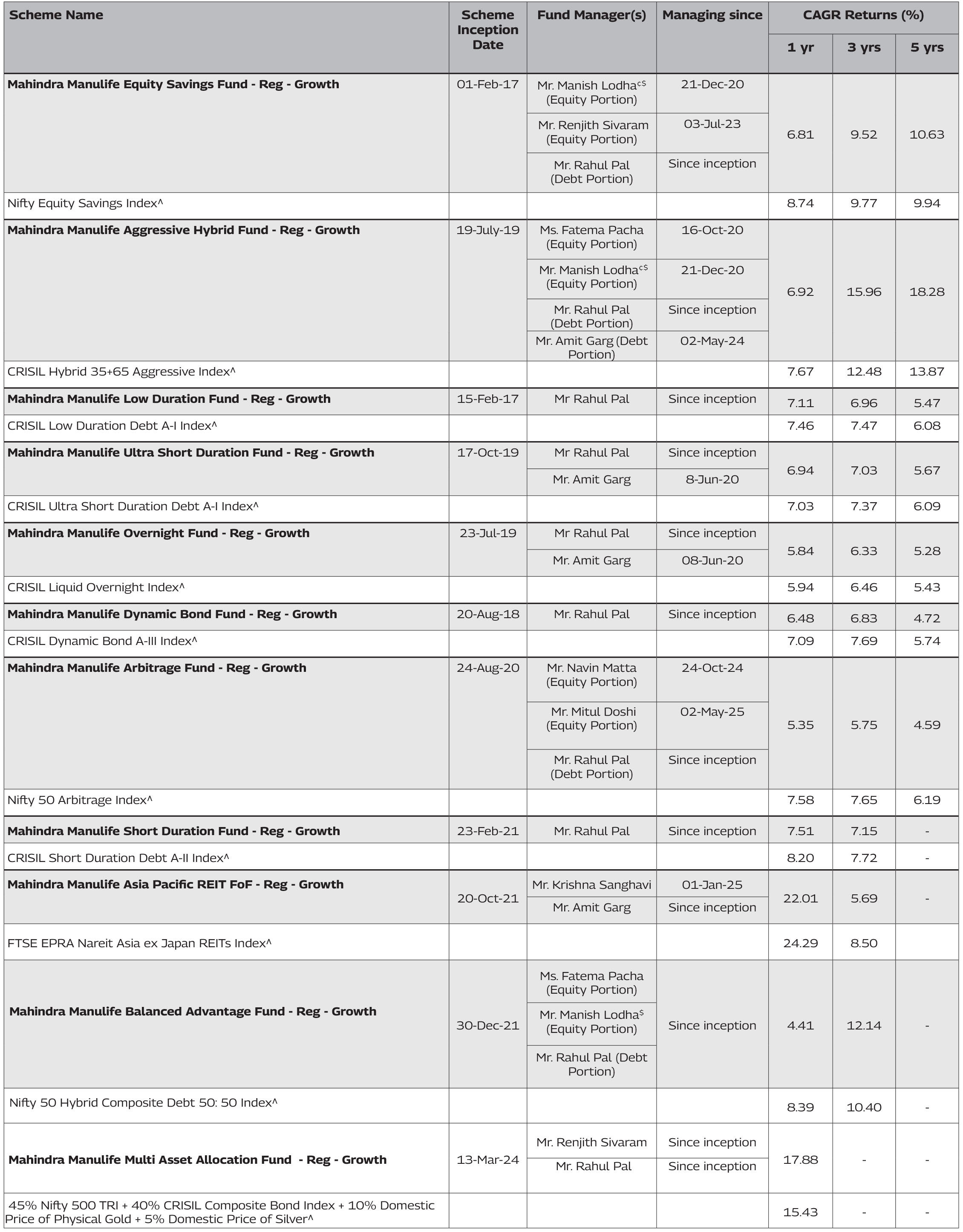 Note: As November 29 & 30, 2025 was a non-business days, the schemes returns disclosed are as on November 28, 2025, except for Mahindra Manulife Liquid Fund and Mahindra Manulife Overnight Fund which is as of November 30, 2025.