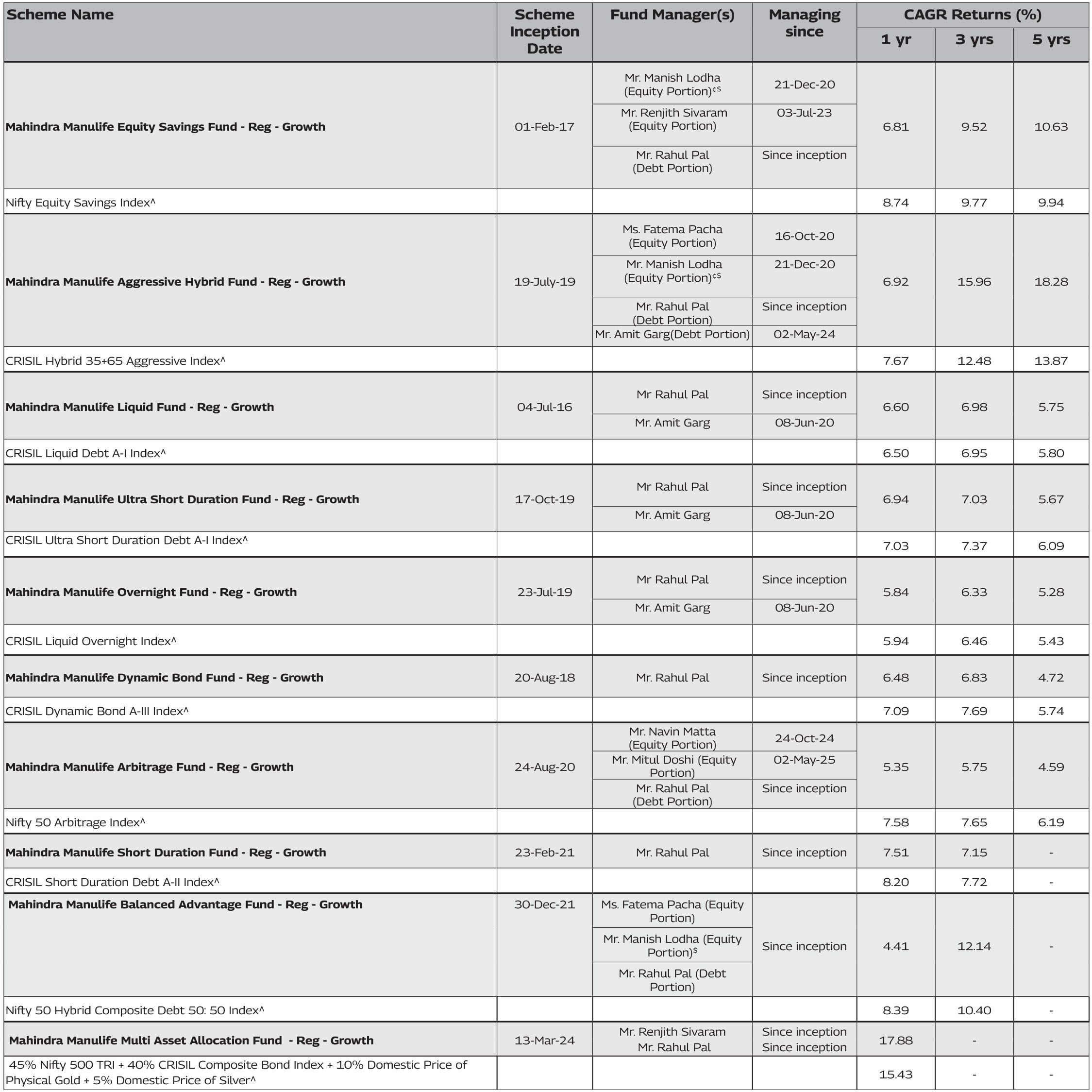 Note: As November 29 & 30, 2025 was a non-business days, the schemes returns disclosed are as on November 28, 2025, except for Mahindra Manulife Liquid Fund and Mahindra Manulife Overnight Fund which is as of November 30, 2025.