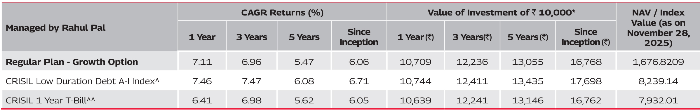 Benchmark: CRISIL Low Duration Debt A-I IndexNote: The data/statistics given above are to explain general market trends in the securities market, it should not be construed as any research report/research recommendation.