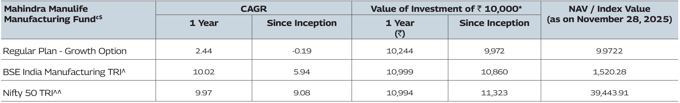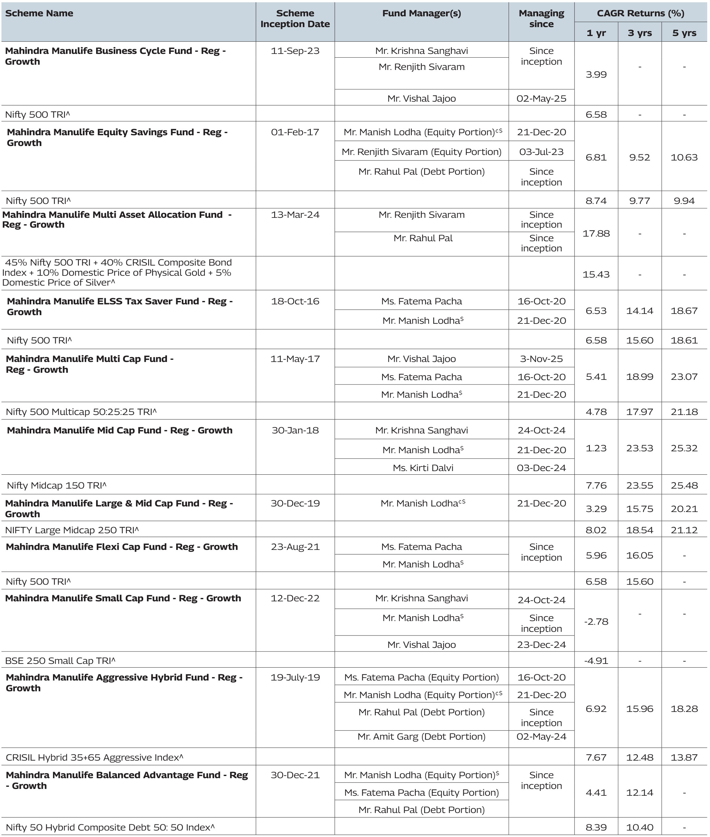 Note: As November 29 & 30, 2025 was a non-business days, the schemes returns disclosed are as on November 28, 2025, except for Mahindra Manulife Liquid Fund and Mahindra Manulife Overnight Fund which is as of November 30, 2025.