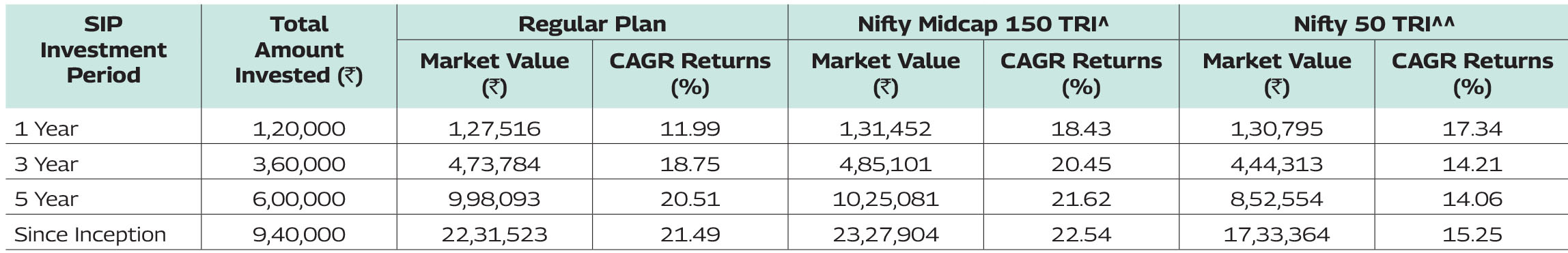 Past performance may or may not be sustained in future and should not be used as a basis of comparison with other investments. Returns greater than 1 year period are compounded annualized. For SIP returns, monthly investment of equal amounts invested on the 1st business day of every month has been considered. CAGR Returns (%) are computed after accounting for the cash flow by using the XIRR method (investment internal rate of return).