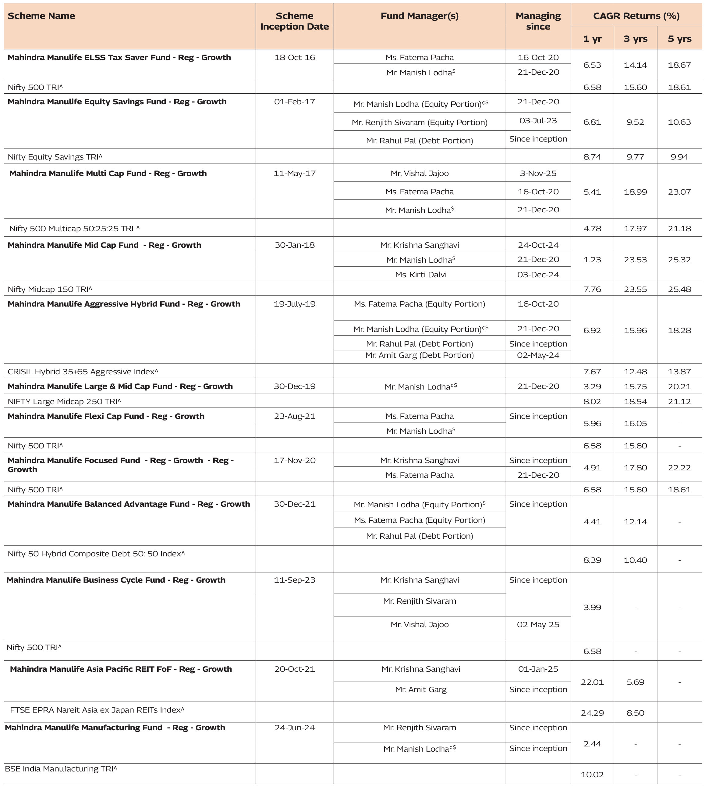 schemes and Mr. Vishal Jajoo manages 5 schemes each of Mahindra Manulife Mutual Fund. The performance data for the schemes which have not completed one year has not been provided.