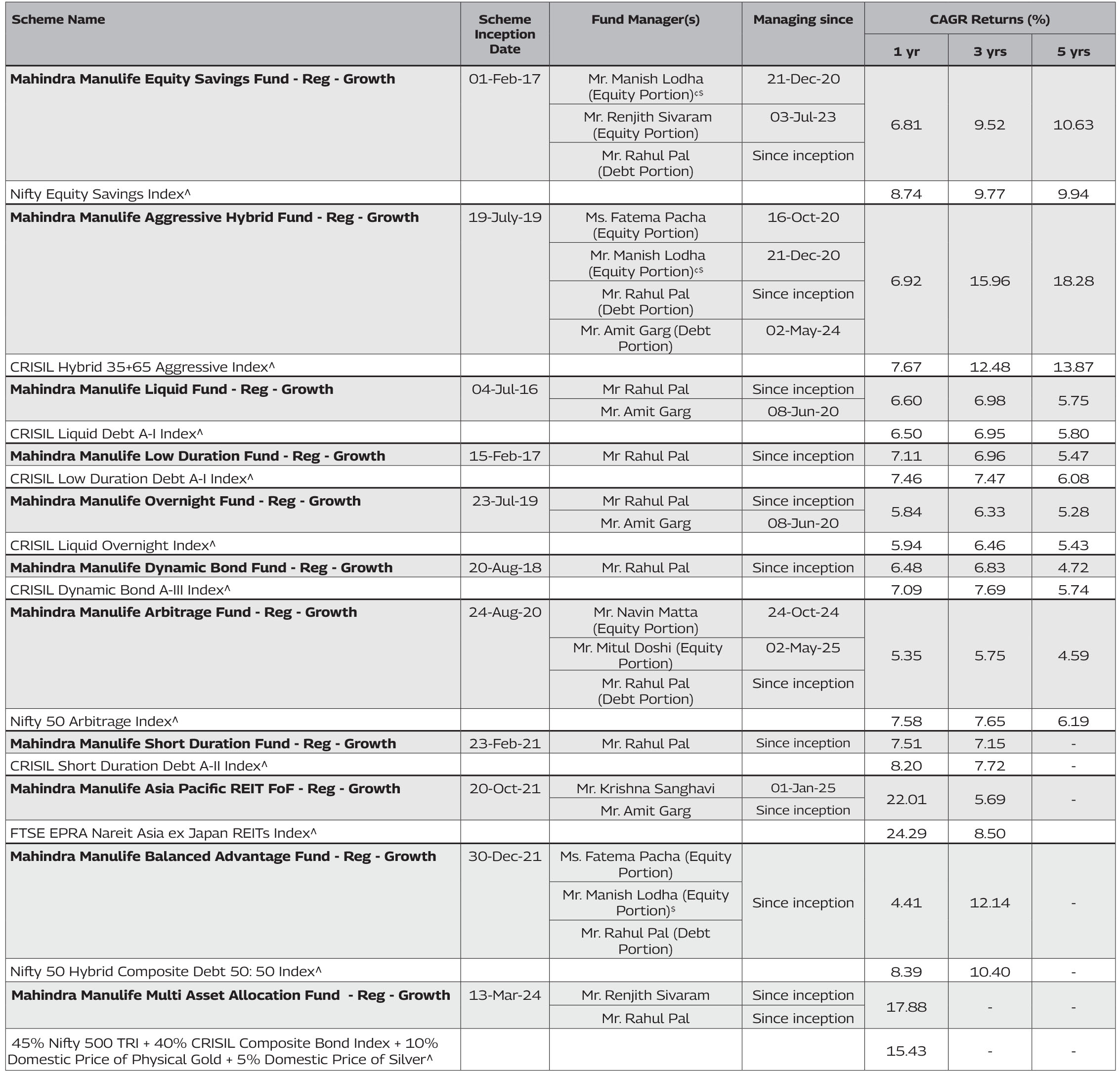 Note: As November 29 & 30, 2025 was a non-business days, the schemes returns disclosed are as on November 28, 2025, except for Mahindra Manulife Liquid Fund and Mahindra Manulife Overnight Fund which is as of November 30, 2025.