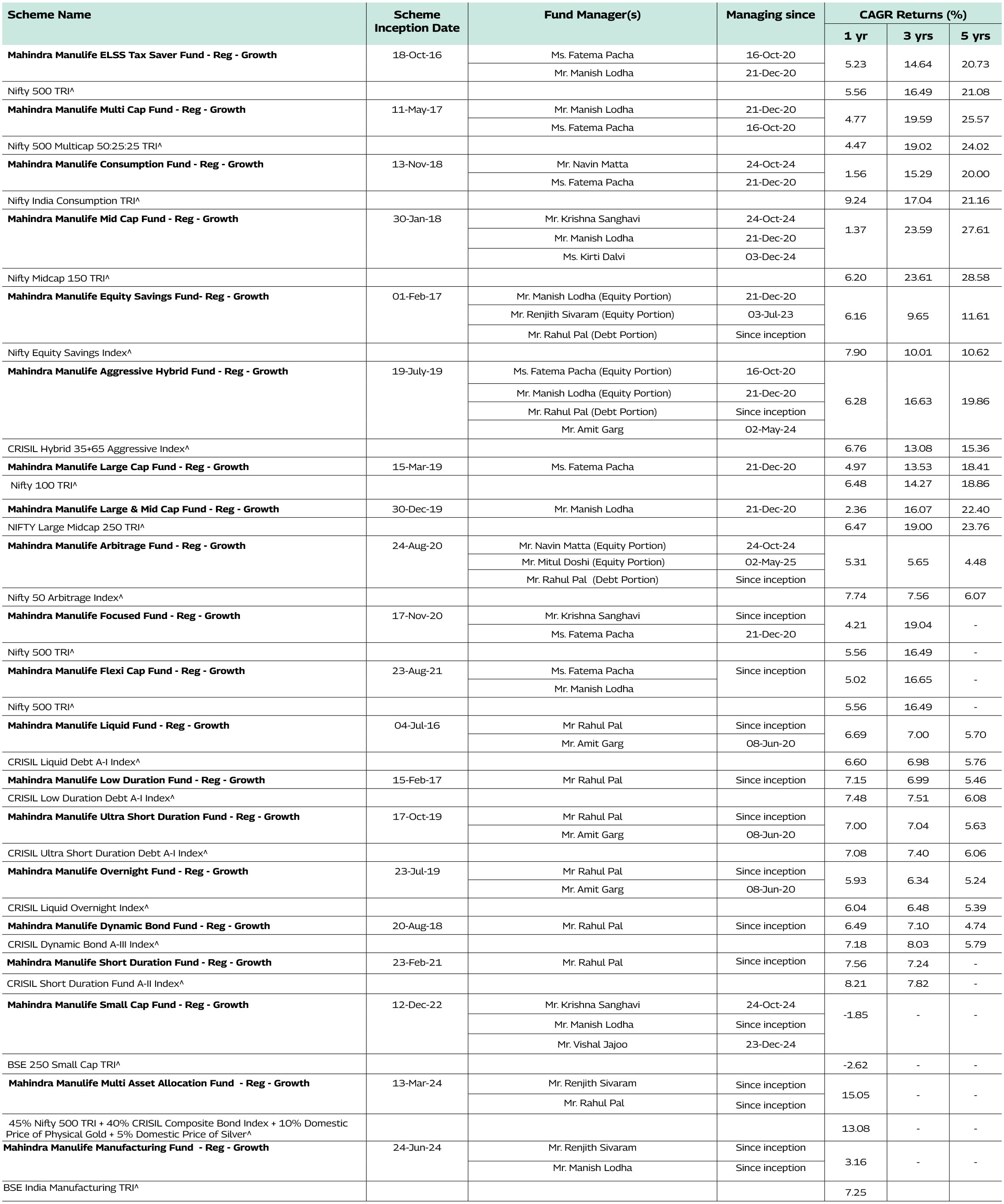 Ms. Fatema Pacha manages 8 schemes each of Mahindra Manulife Mutual Fund. The performance data for the schemes which have not completed one year has not been provided.