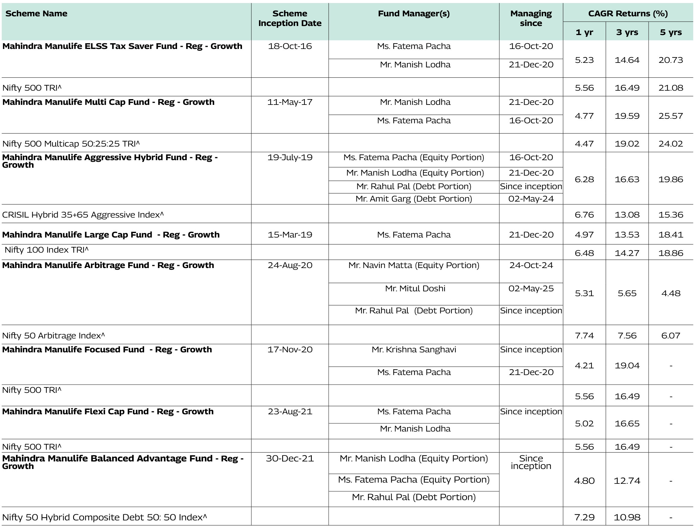 Ms. Fatema Pacha manages 8 schemes of Mahindra Manulife Mutual Fund. The performance data for the schemes which have not completed one year has not been provided.