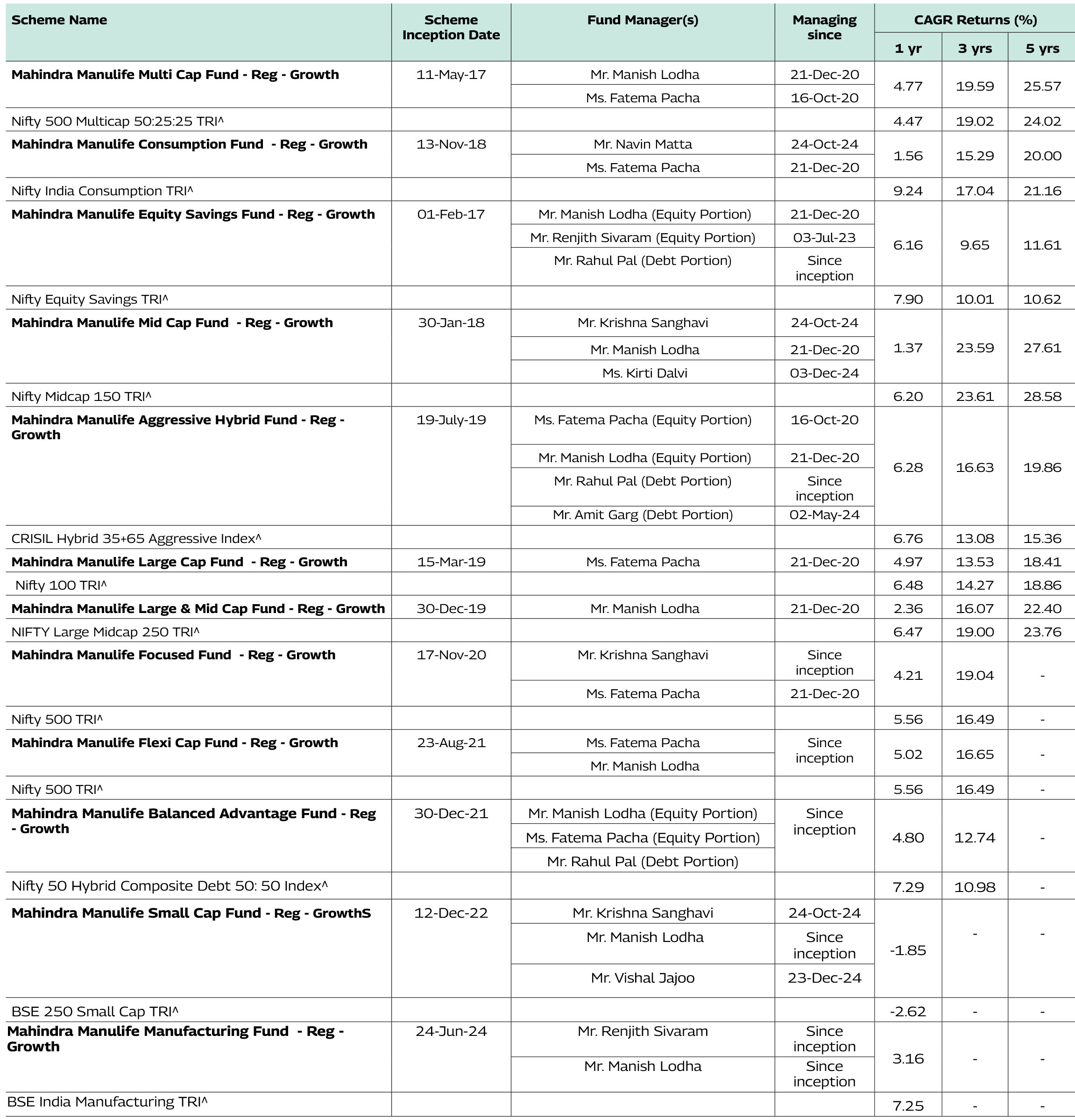 Mr. Manish Lodha manage 10 schemes each of Mahindra Manulife Mutual Fund. The performance data for the schemes which have not completed one year has not been provided.