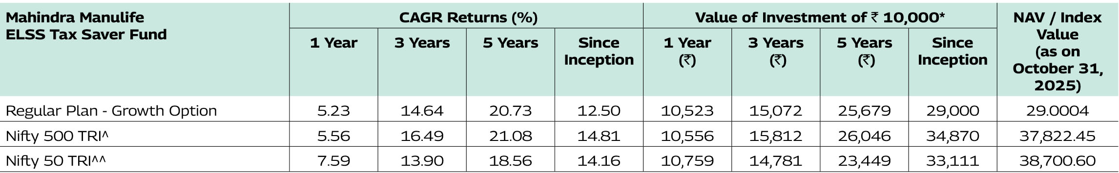 | *Assuming investor uses the entire ₹ 1.50 lac limit available under section 80C of the Income Tax Act 1961 for investing in Mahindra Manulife ELSS Fund. The tax benefit is calculated on the basis of current applicable tax rates under the old regime, ignoring marginal relief on surcharge, if any, for net taxable income between ₹ 50 lacs and ₹ 1 crore. The Finance Act 2020 has introduced a new income tax regime at concessional tax rates for individual taxpayers. However, the option for such concessional tax regime requires the taxpayer to forego certain solicited deductions including deduction u/s 80C of Income Tax Act. 1961. Please consult your financial / tax advisor before investing. | |