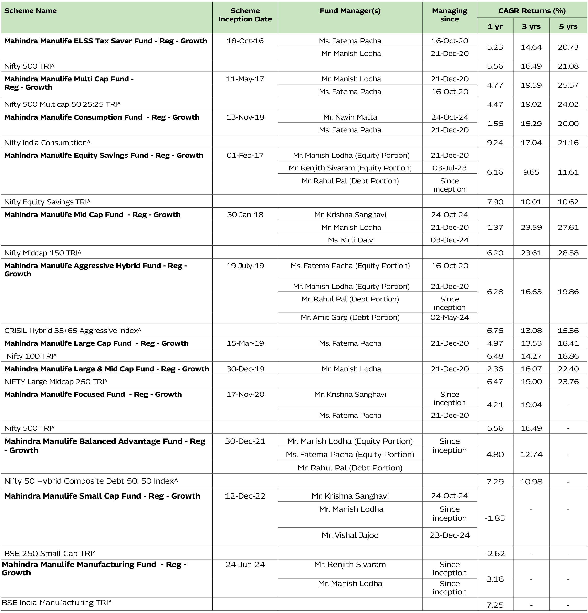 manage 8 schemes each of Mahindra Manulife Mutual Fund. The performance data for the schemes which have not completed one year has not been provided.
