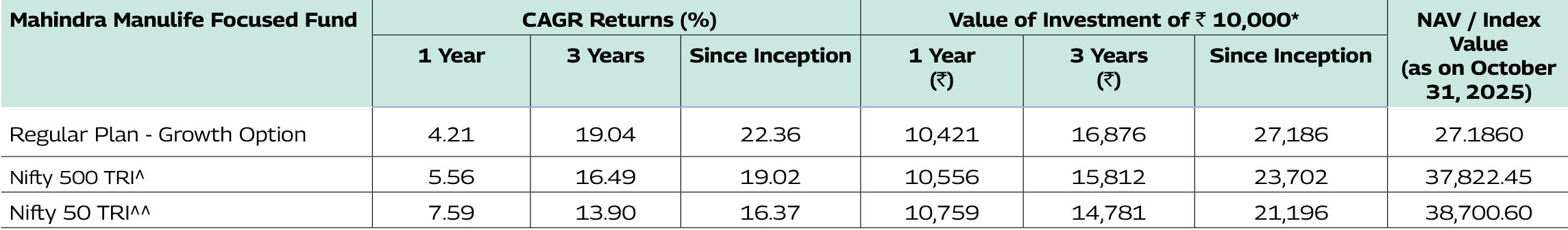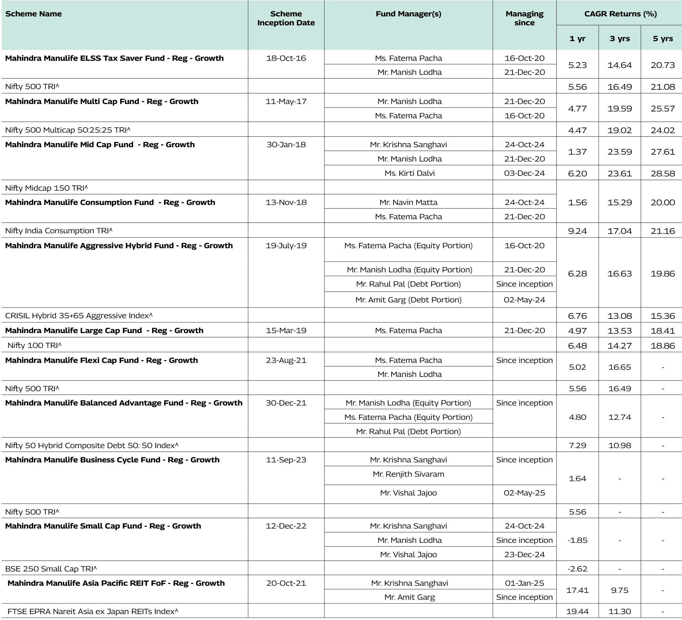 Note: The performance data of Mahindra Manulife Value Fund has not been provided as the scheme has not completed 1 year since inception. The said Scheme is managed by Mr. Krishna