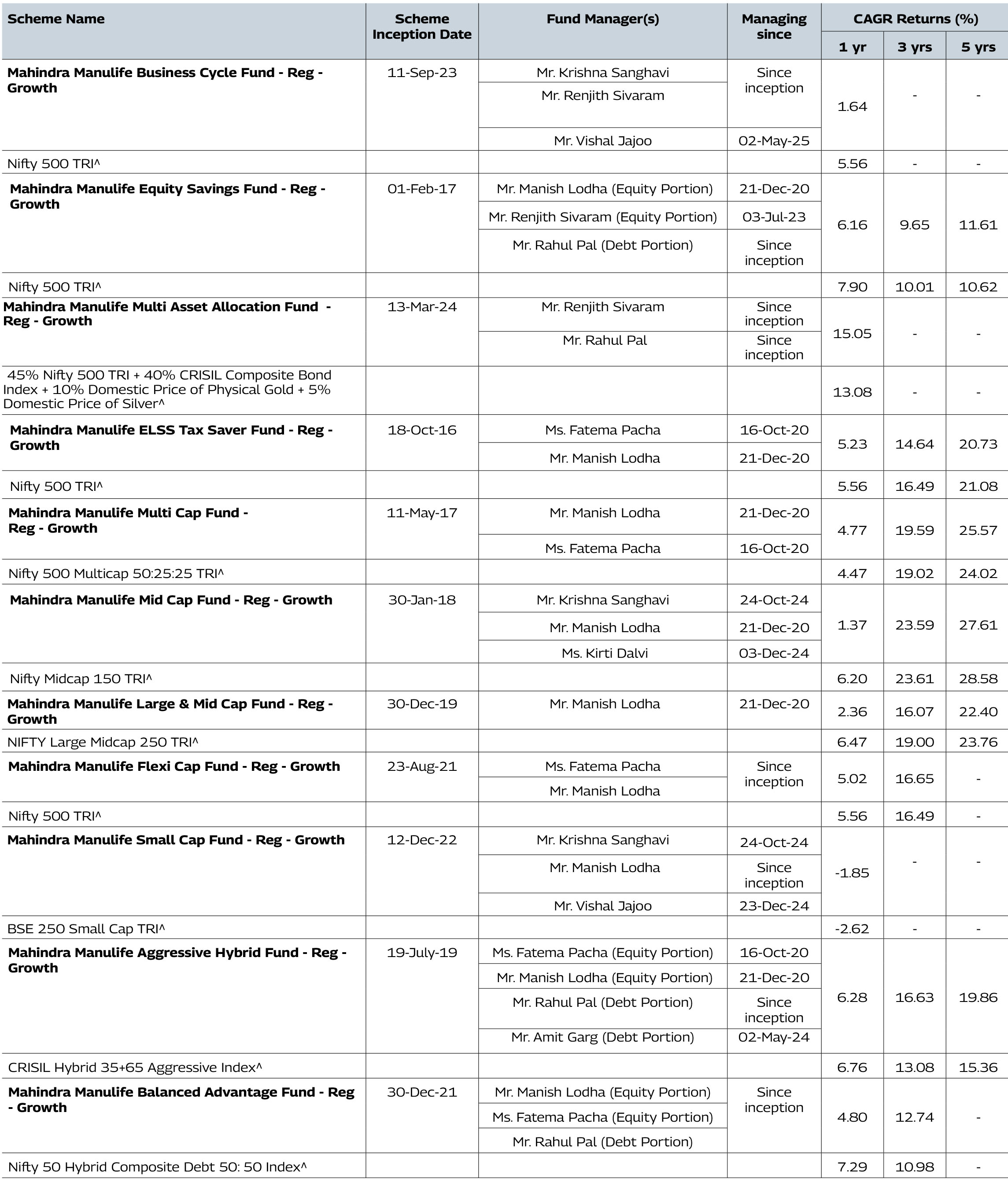 schemes of Mahindra Manulife Mutual Fund. The performance data for the schemes which have not completed one year has not been provided.